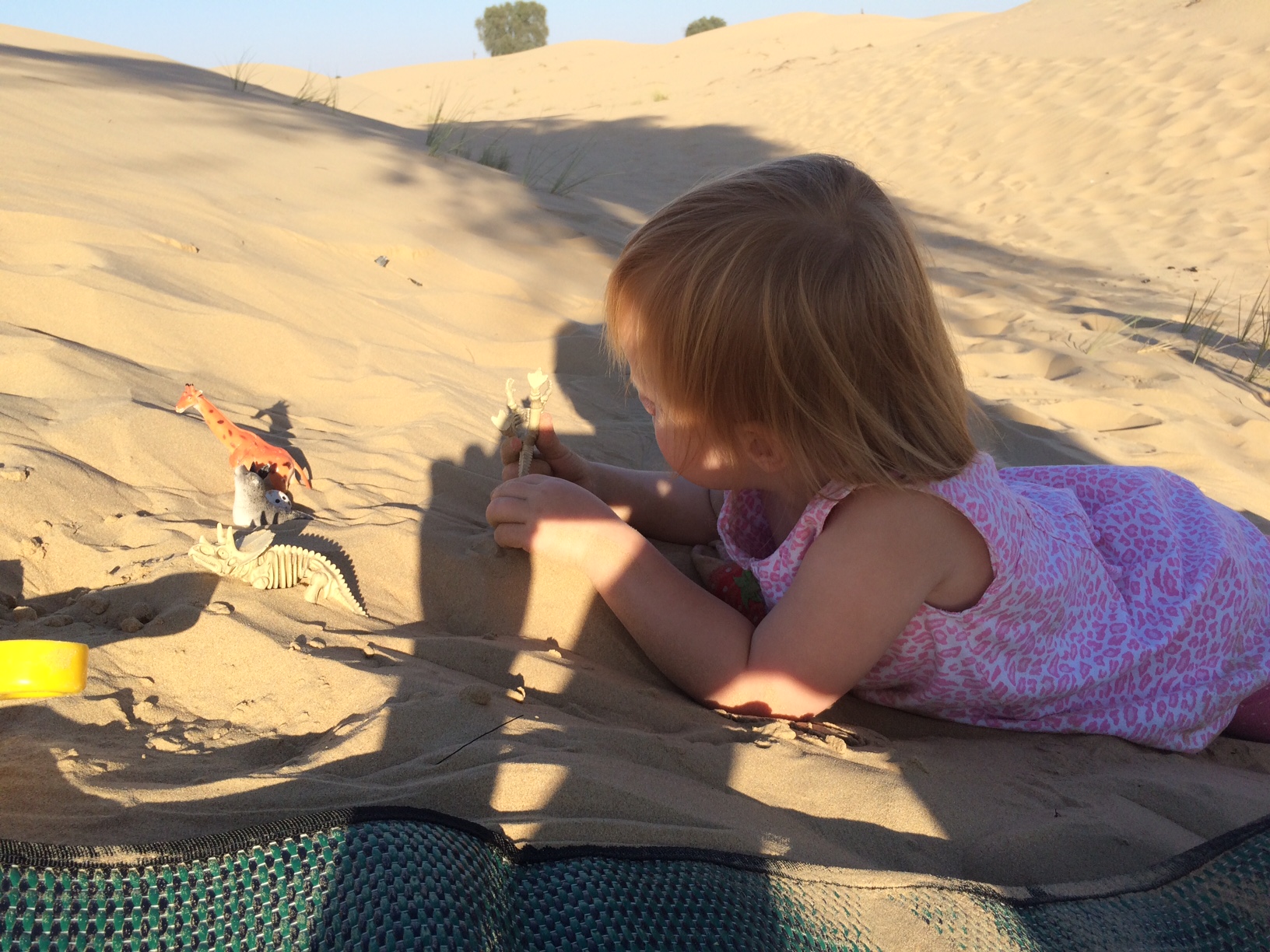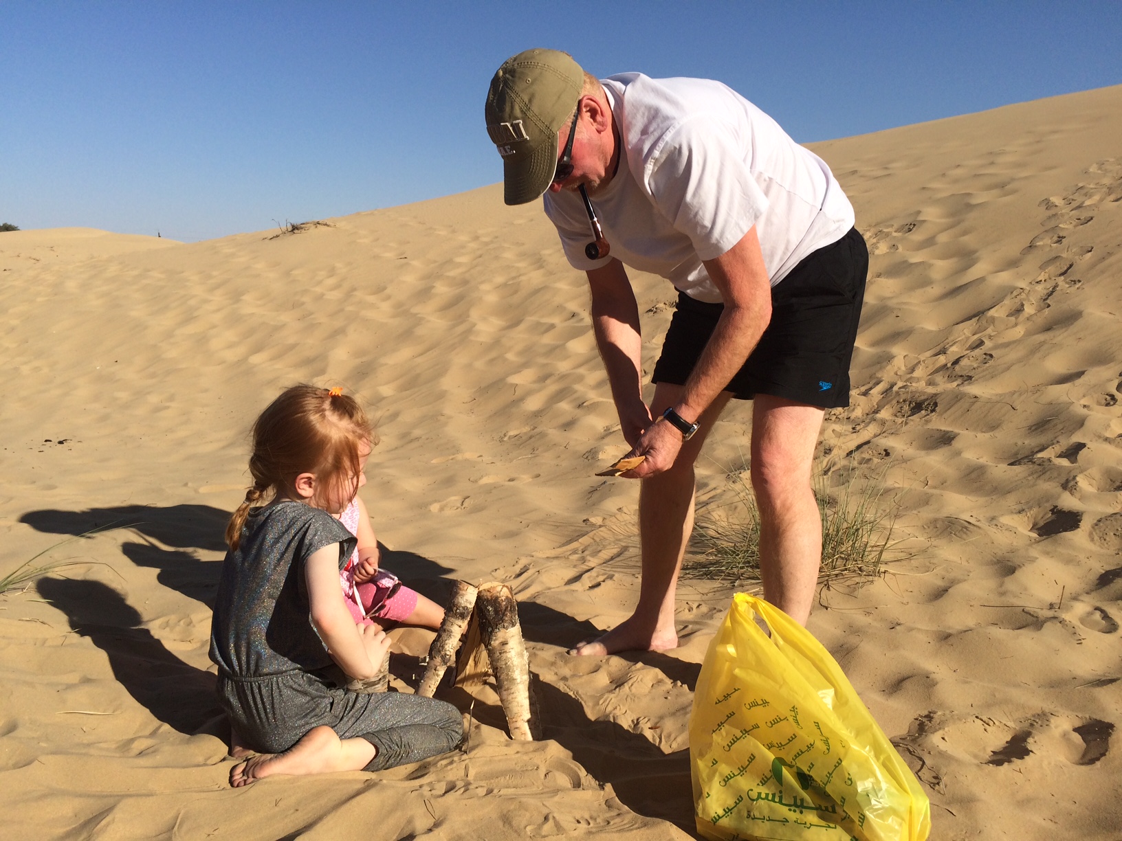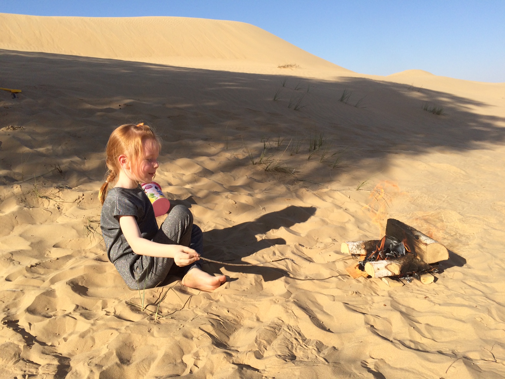 Her skifter hun mellem at småpive “Mia likey go home now” og at begrave hænder, fødder og dinosaurer i sandet.IMG_5405IMG_5408Ved fire-tiden foreslår jeg Morfar at tænde et lille bål sammen med pigerne. Ingen ordentlig ørkentur uden bål, vel?