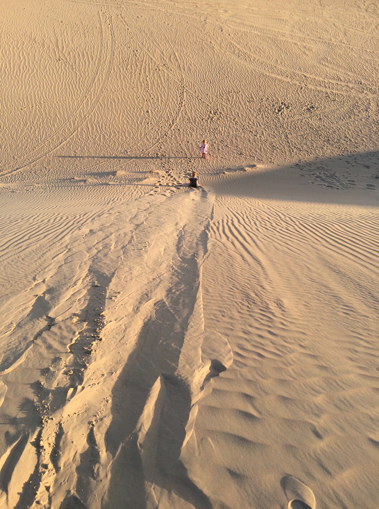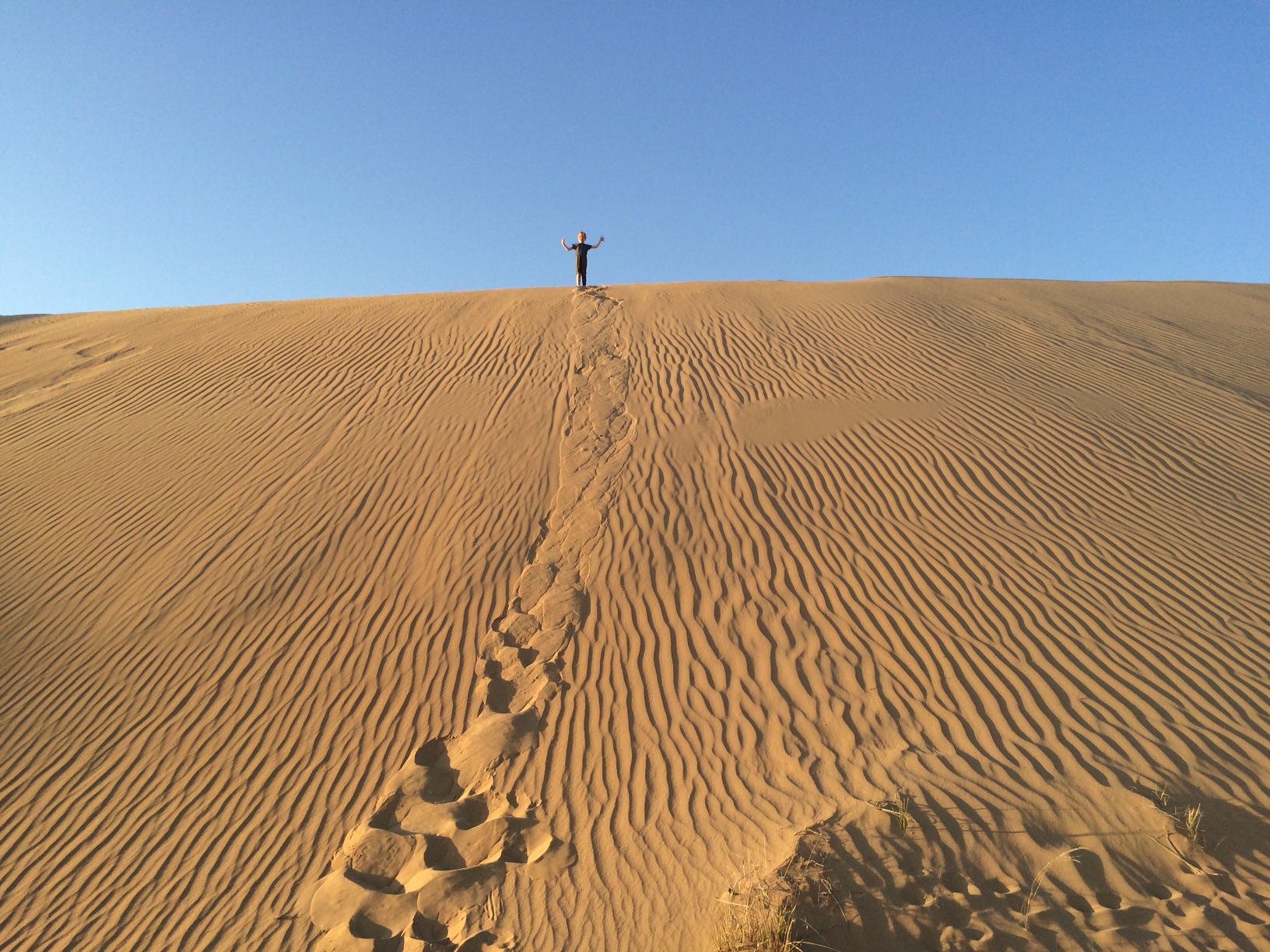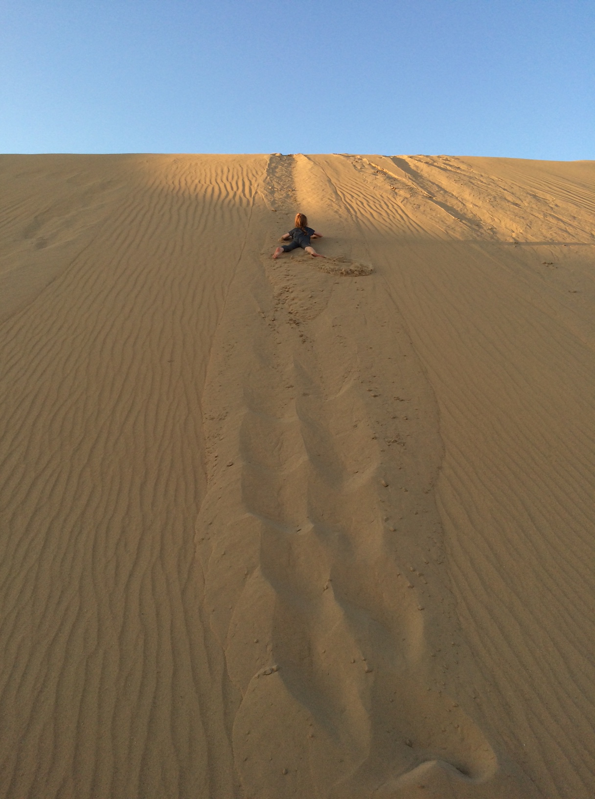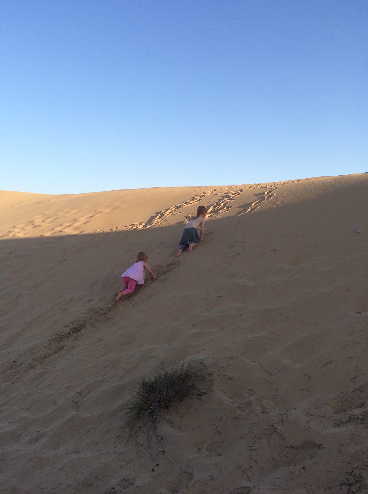 Det er grænseoverskridende for ham at mærke sand mellem tæerne, men ørkenen er alligevel tillokkende – fremmed og eksotisk – så han accepterer velvilligt at tilbringe en eftermiddag i den store sandkasse.IMG_5403IMG_5412IMG_5414Cille er til gengæld i sit rette element. Hun elsker at klatre op højt op og kure ned med lommerne fulde af sand.IMG_5427IMG_5434På et tidspunkt opdager hun en rigtig høj top og beslutter sig for at klatre derop.