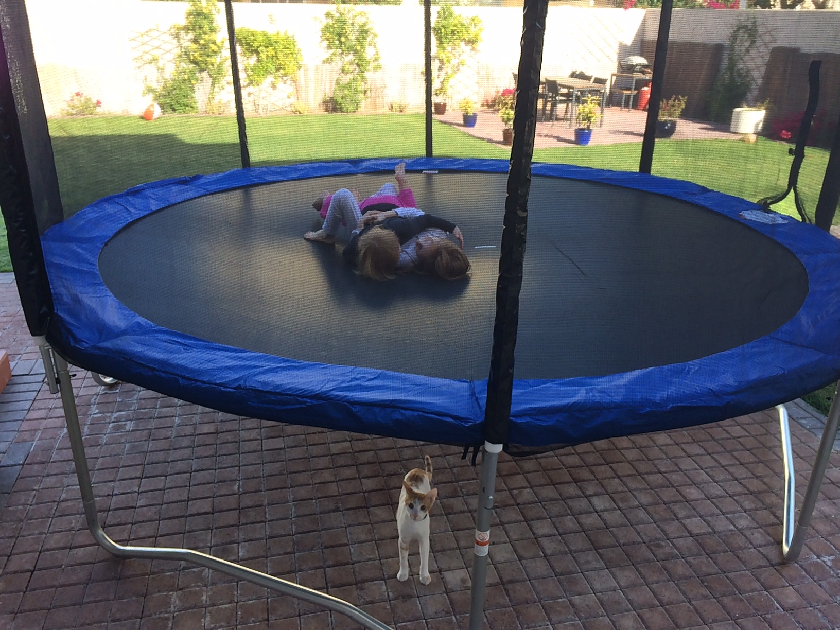De hopper og ruller rundt i kærligt favntag på trampolinen.IMG_5439 2 sekunder senere er latterudbruddet forstummet til fordel for en voldsom diskussion om hvem der er en “smelly nappy baby” eller “hvem der kan runne fastest”.