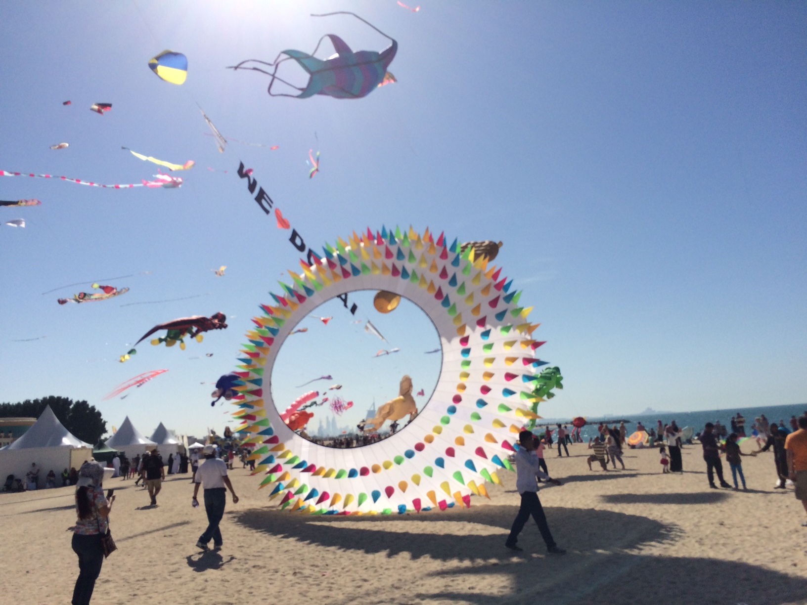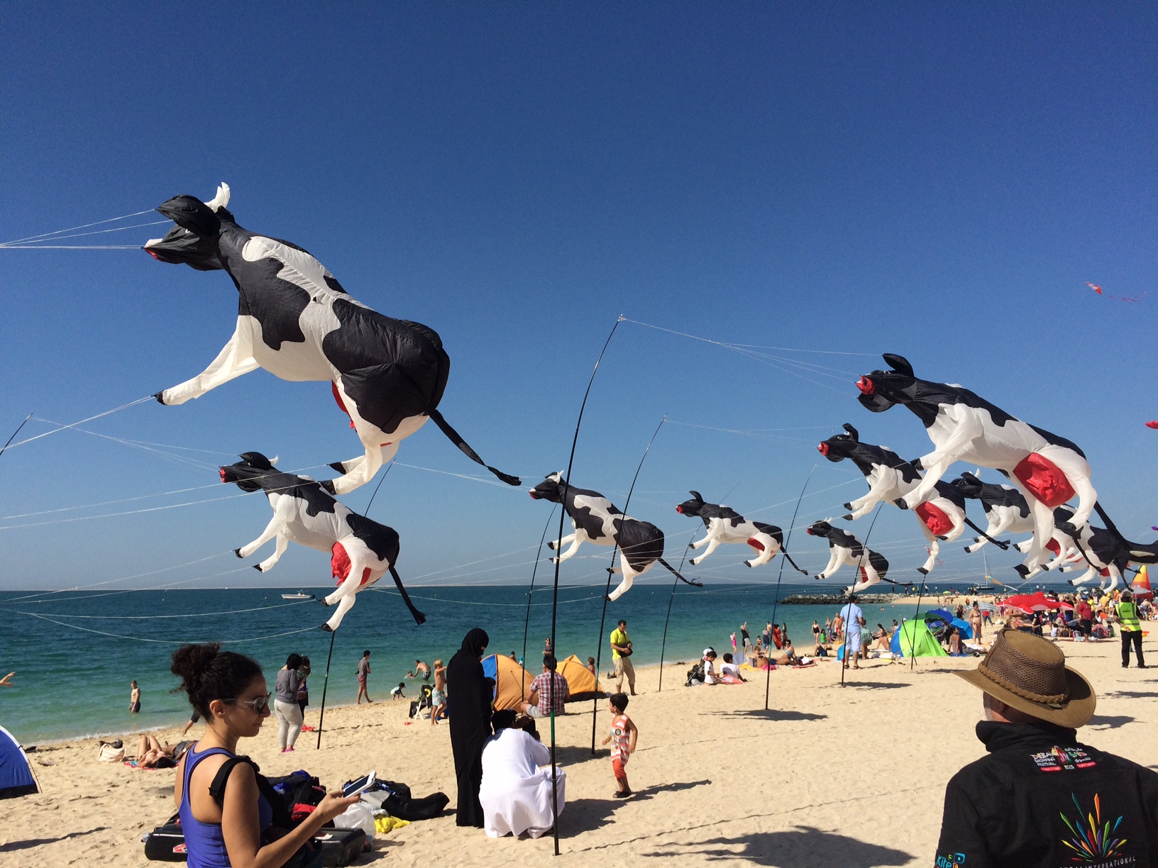 Der er fuld gang i den på Jumeirah Beach.IMG_5443IMG_5444IMG_5445Jeg er ret vild med de flyvende, sortbrogede malkekøer.IMG_5446Og så er jeg ret vild med de to, der går hånd i hånd i sandet, mens de spejder efter vores venner.IMG_5447Børnene leger glade sammen i sandet og i det (i Dubai’sk forstand) iskolde vinterhav.IMG_5451IMG_5449IMG_5450Der er en skøn udsigt med alle dragerne, der flyver i havbrisen.IMG_5448 Efter nogle timer med vandplaskeri og dragekiggeri vender vi næsen hjemad.