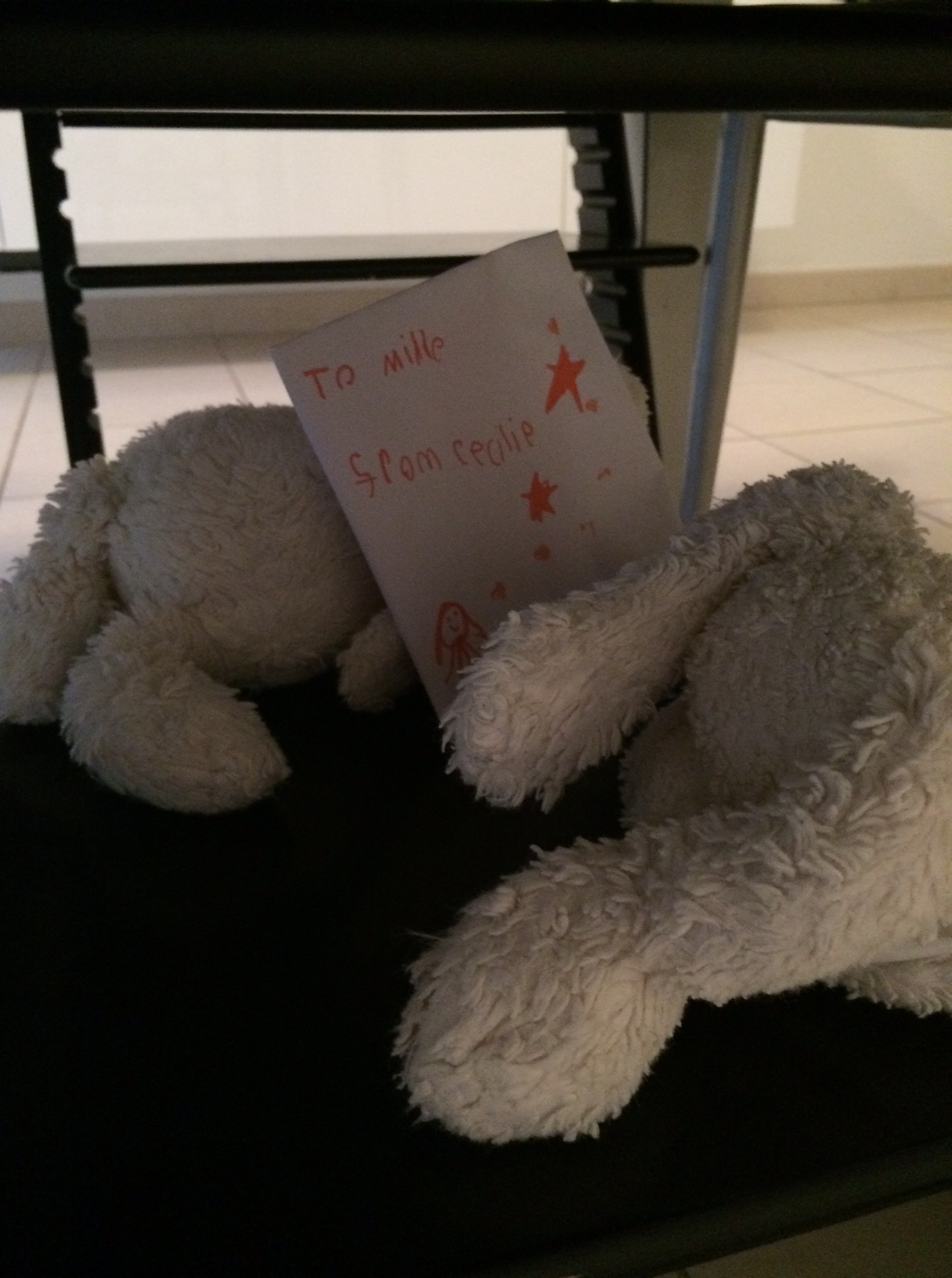 Hun skriver et brev til Mille, hvori hun lægger en lille gave (i dette tilfælde en fin, rød fjer), og så gemmer hun brevet samt Milles yndlingsbamser på stolen, så det kommer som en overraskelse, når Mille sætter sig til bords.IMG_5452Så ender det alligevel godt i den lille, samspilsramte familie.IMG_5455 IMG_5454IMG_5453Happy ending. Det ka’ vi li’. For virkelighed.