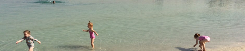 Vi går på stranden og finder stribede fisk i lagunen og miniature-eremitkrebs. Vandet er behageligt i temperatur og sandet er fyldt af fine skaller.