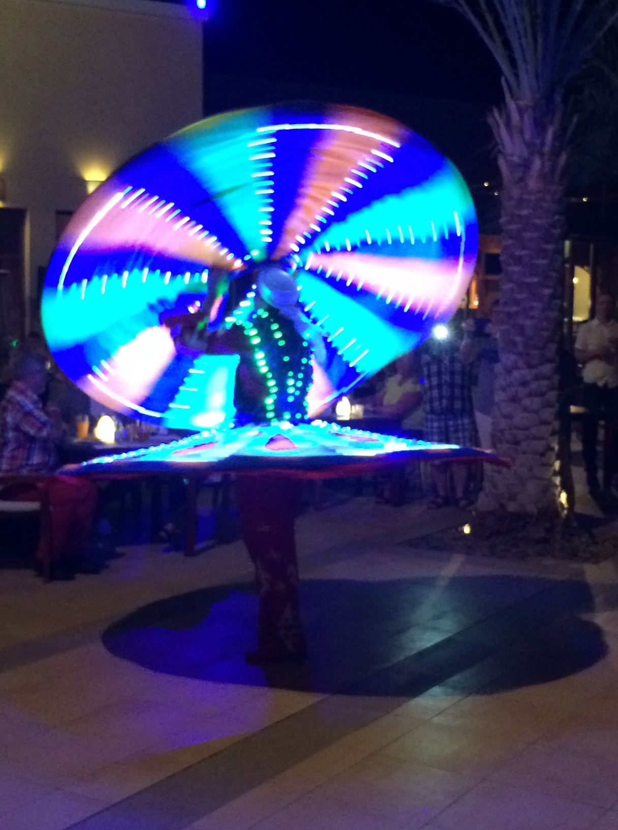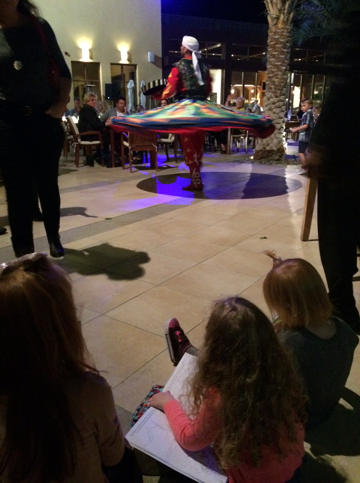 Om aftenen er der festlige araber-indslag med en smuk mavedanserinde og ham-der-manden-der-drejer-rundt-om-sig-selv-i-tyve-minutter-uden-at-brække-sig.