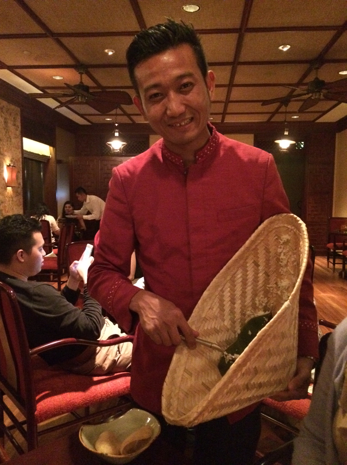 Se lige her – en storsmilende og imødekommende tjener med en siv-kurv, hvorfra han serverer jasminris ad libitum.IMG_5867Selvsamme tjener finder da også lige et bord til damernes tasker, så de ikke skal stå på gulvet.