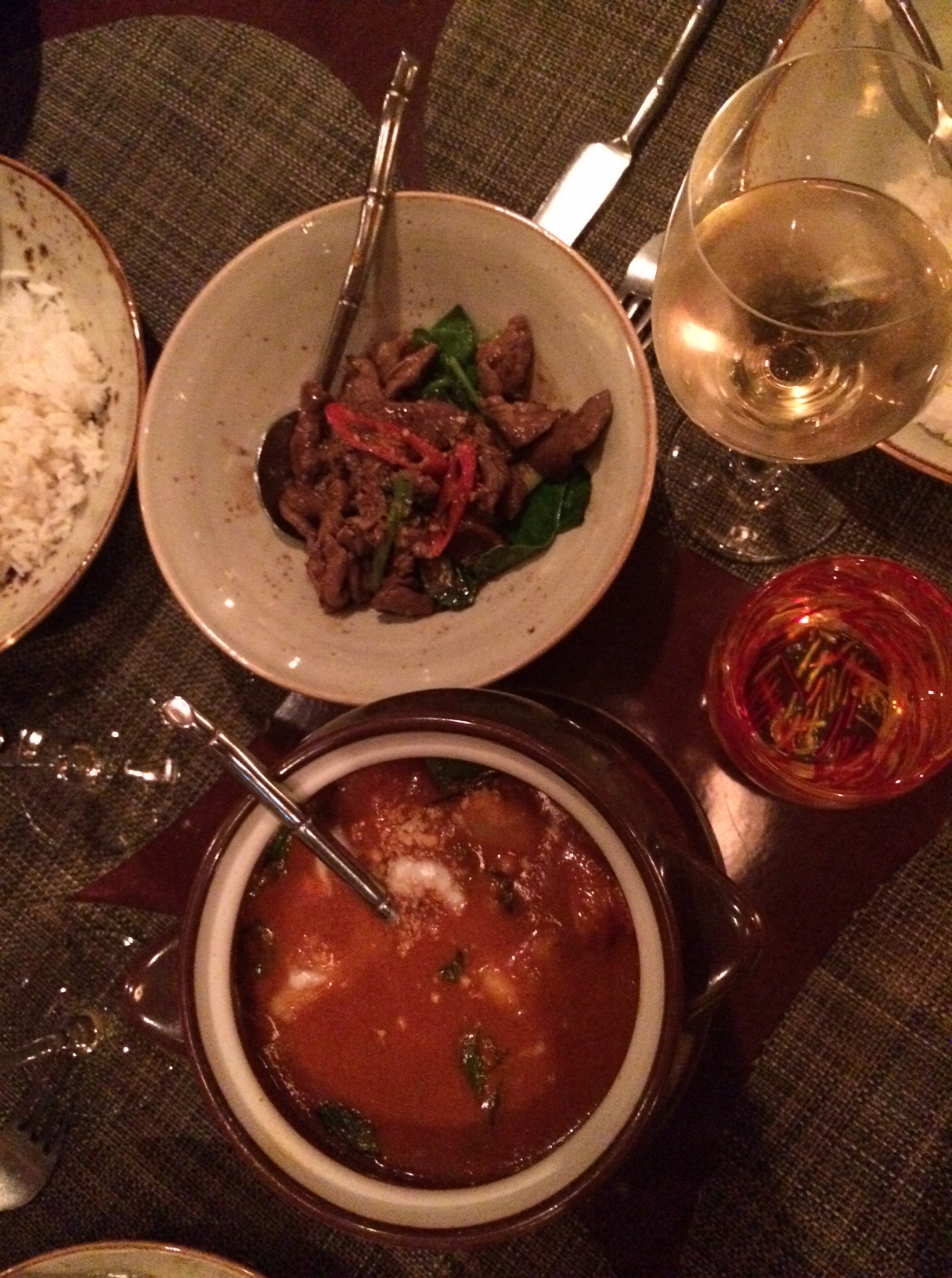 Sticky beef, spring rolls, stir fry wok, chicken satay, red curry med tigerrejer, crab cakes, pomelosalat med knasende sprød kokosnød og ristede peanuts. Hertil et væld af dips og saucer, der komplimenterer de forskellige retter.IMG_5866 IMG_5868Vi er i madhimlen.