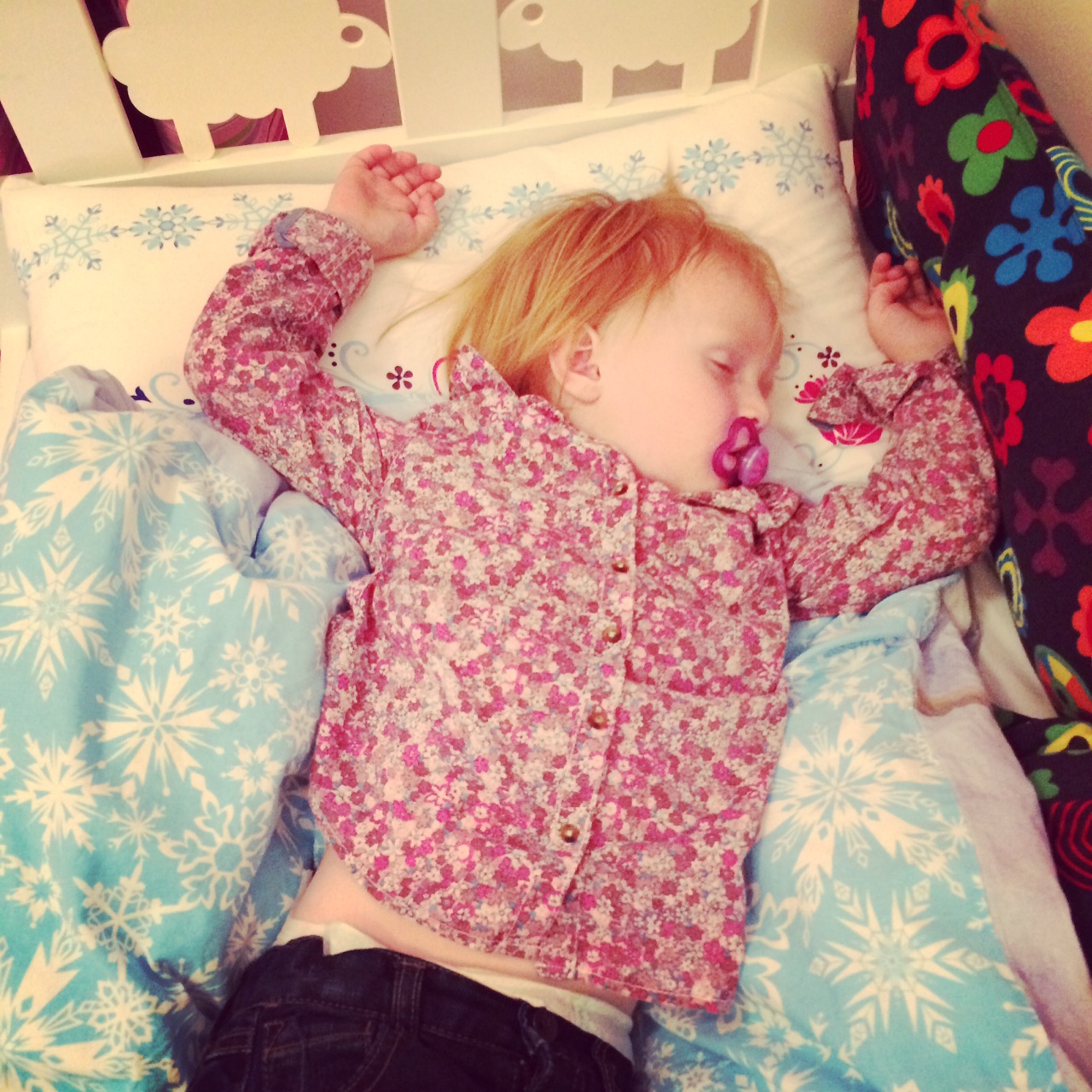 Mille ligger i sin lille seng og ser op på mig med store, runde øjne. Sutten bliver straffet på den hårde klinge.