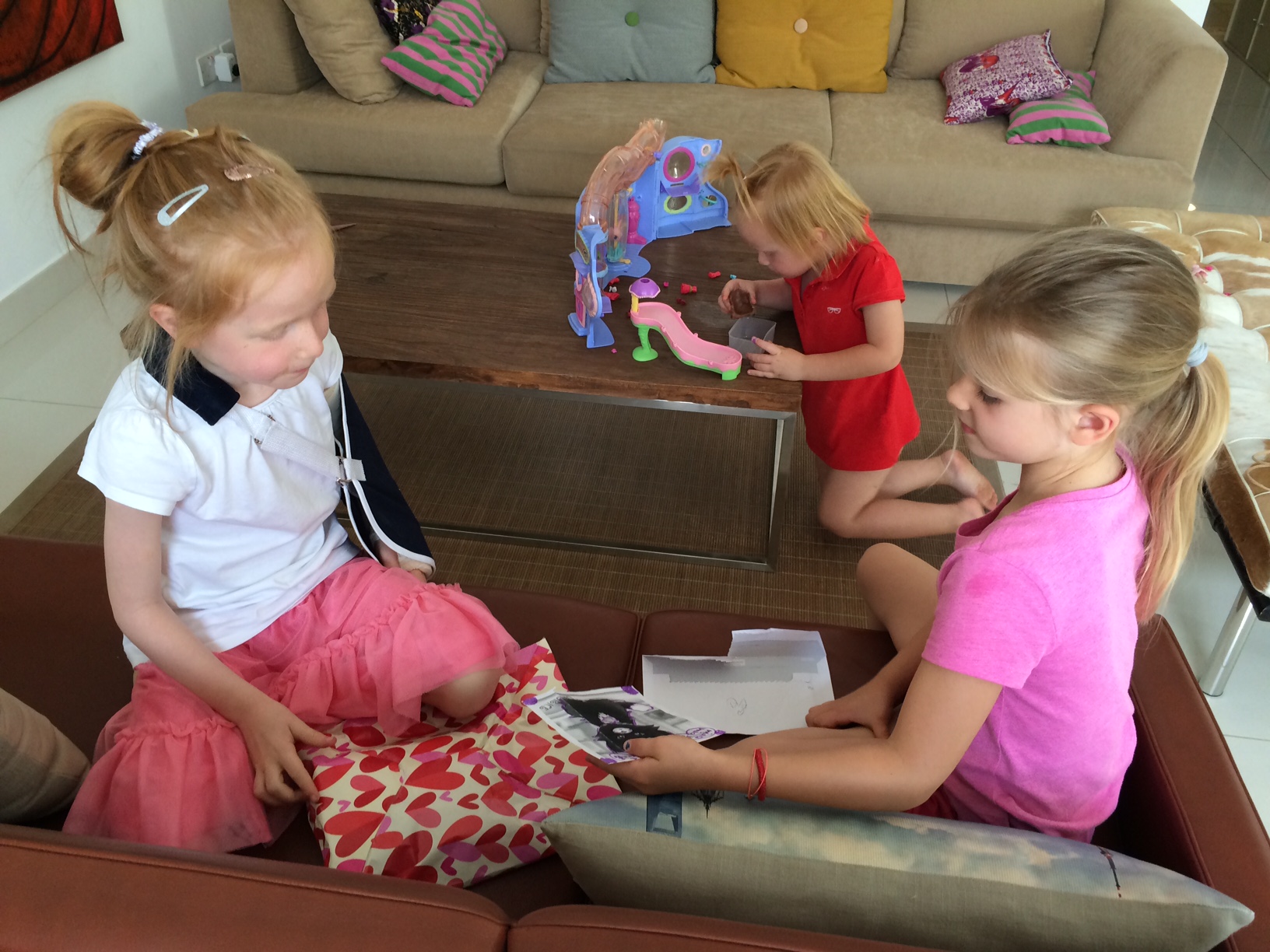 Jeg siger til Tine, at hun skal køre tilbage til vores hus, hvor der er flyttefolk og malere og så hjem til Mille, som er alene med familien K’s søde (men også fremmede) maid.