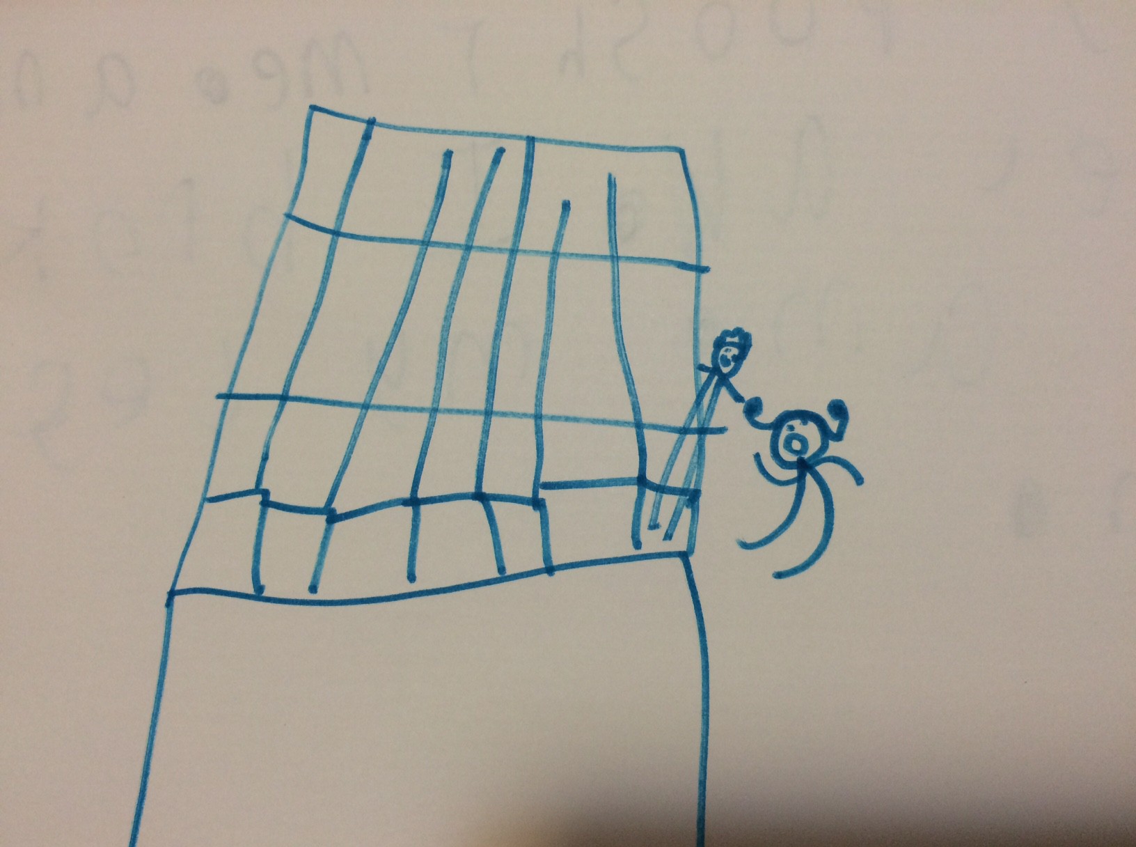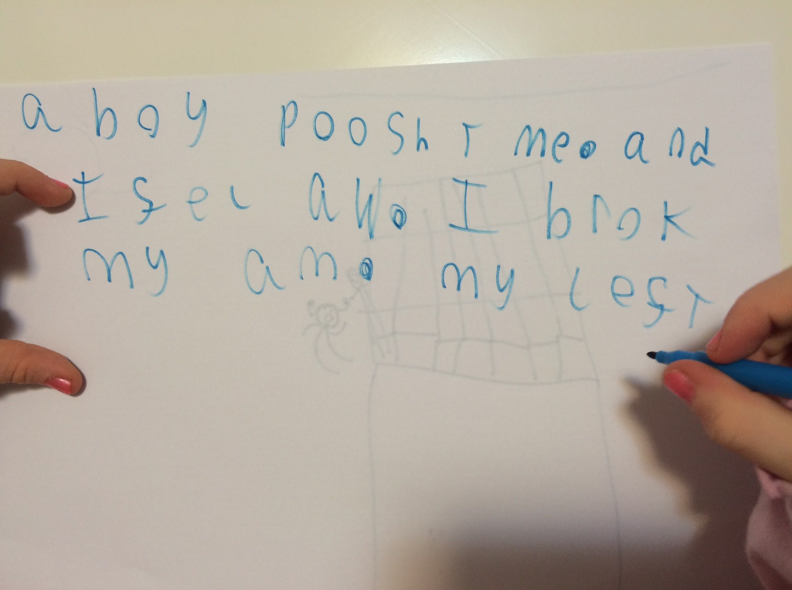 Hun har tegnet en tegning af ulykken, hvor hun bliver skubbet ned fra trampolinen og hun har skrevet en tekst til, som hun vil læse højt for klassen.