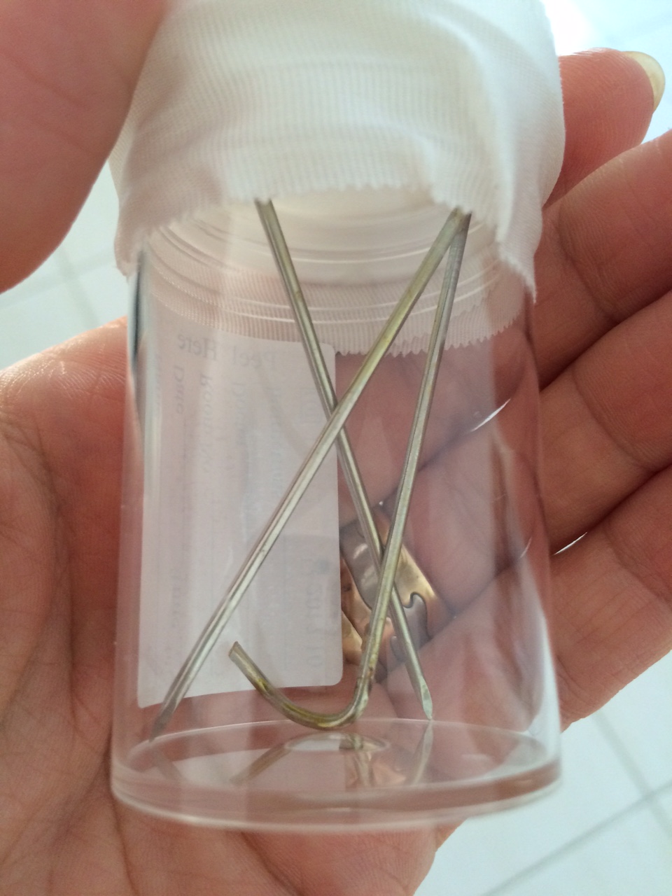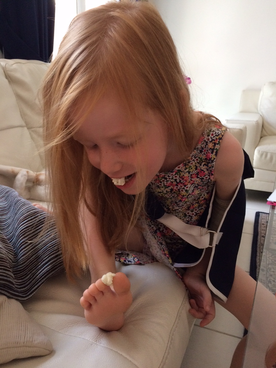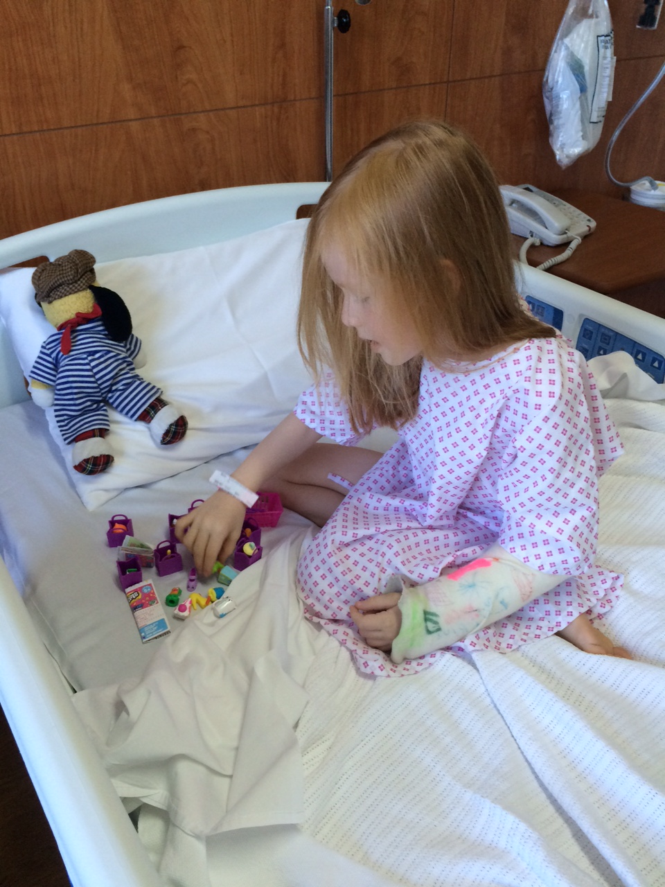 Når man er blevet opereret, må man få lige det, man har lyst til.IMG_6785Og når hun kan spise popcorn med tæerne, så er hun da i bedring, ikke?IMG_6786Det eneste, vi har tilbage som minde om hele miseren er 3 kødnåle i et glas.IMG_6787Og en spaghettitynd arm med 3 små huller, der skal hele og en albue, som skal arbejdes igang efter at have været på stand-by i mange uger.