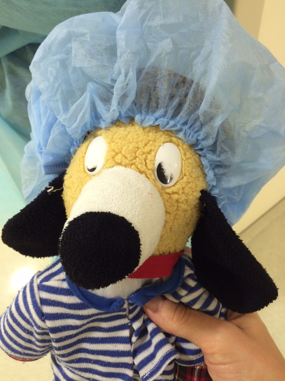 Hånden var mindre skræmmende for hende end masken.IMG_6779Jeg klynger mig til Bjørnen Bjørn, mens vi venter.