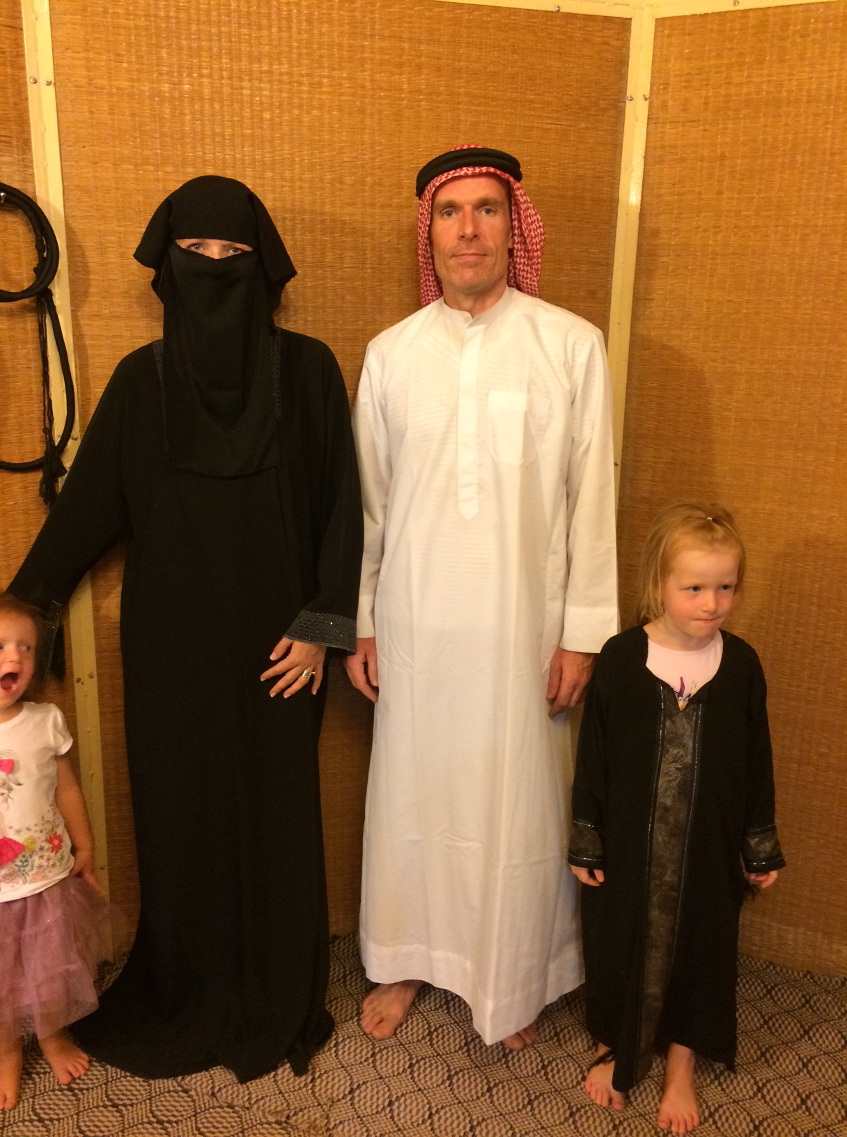 De allerfineste emirati-kvinder er klædt i eksklusive, silke- og chiffonstoffer, som lægger sig om kroppen og ned over hele ansigtet som et uigennemsigtigt slør – og så bærer de handsker. Disse kvinder bliver ført rundt ved hånden af deres mand, søn, far eller bror – for de kan jo intet se!