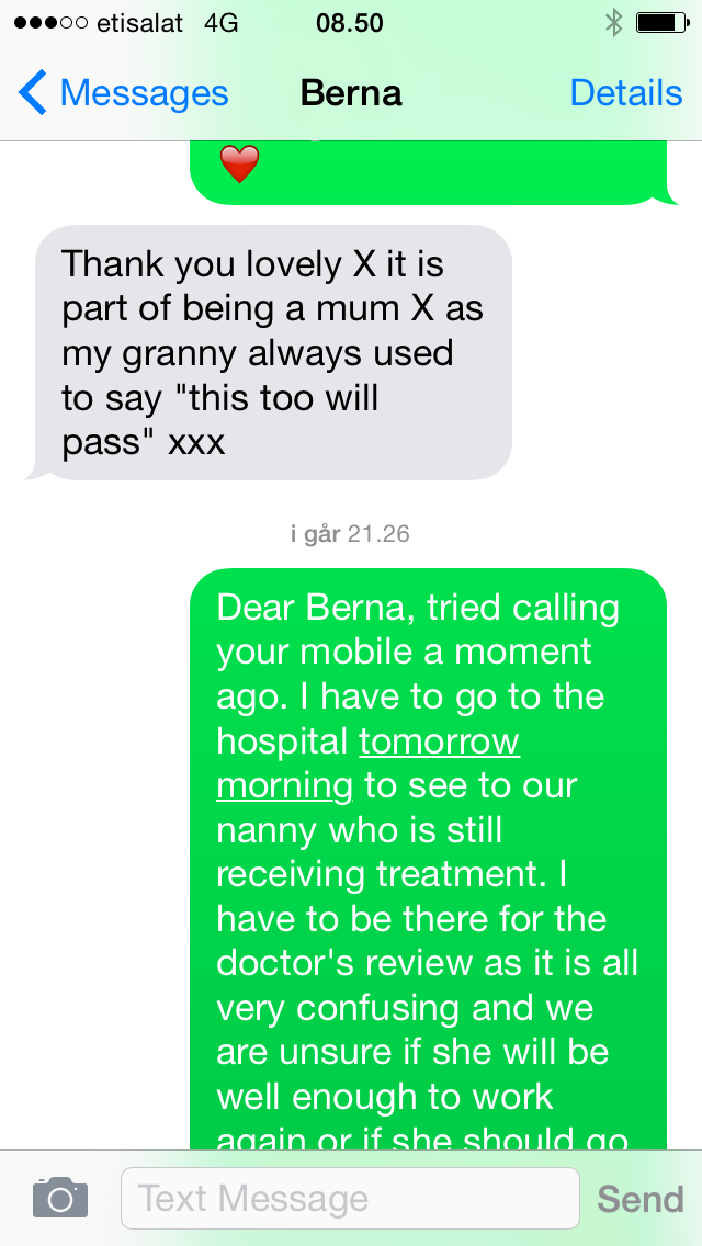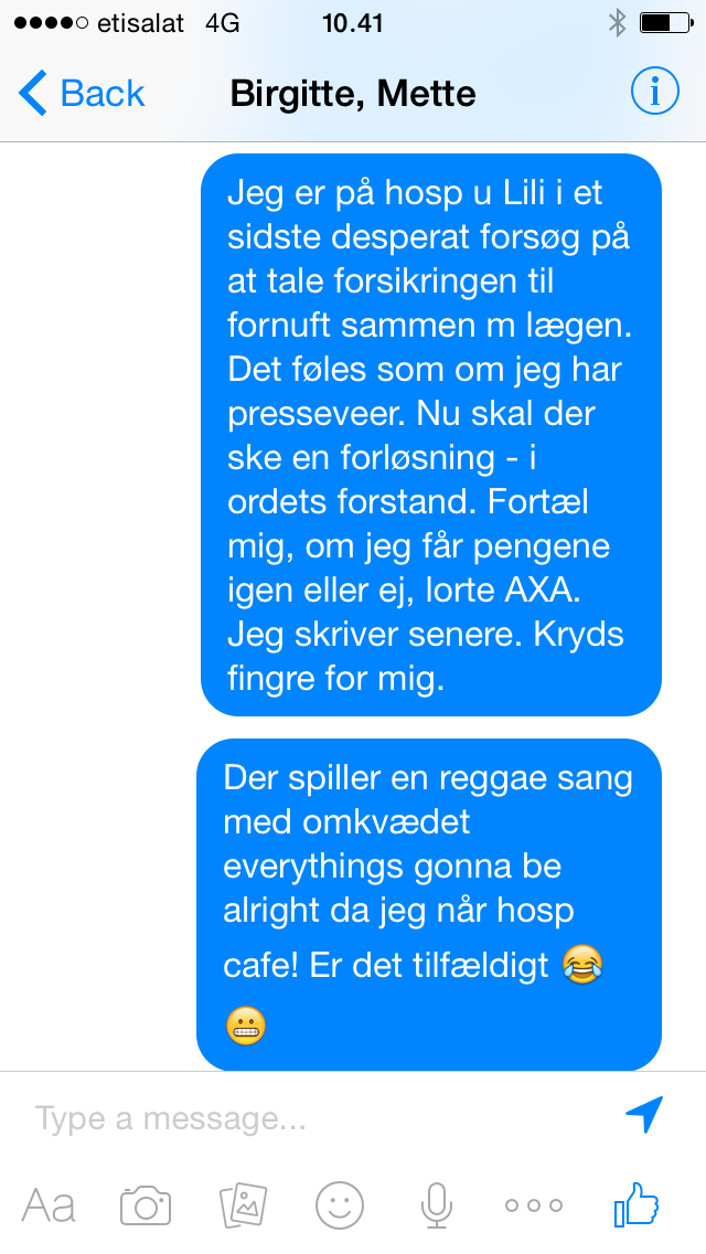 Mens vi venter på lægens stuegang, kigger jeg ned på min telefon og finder en besked frem.