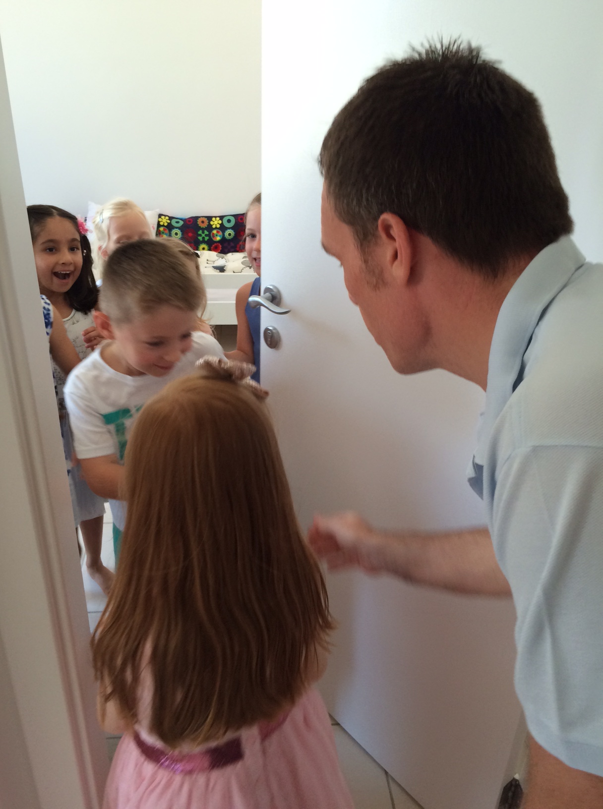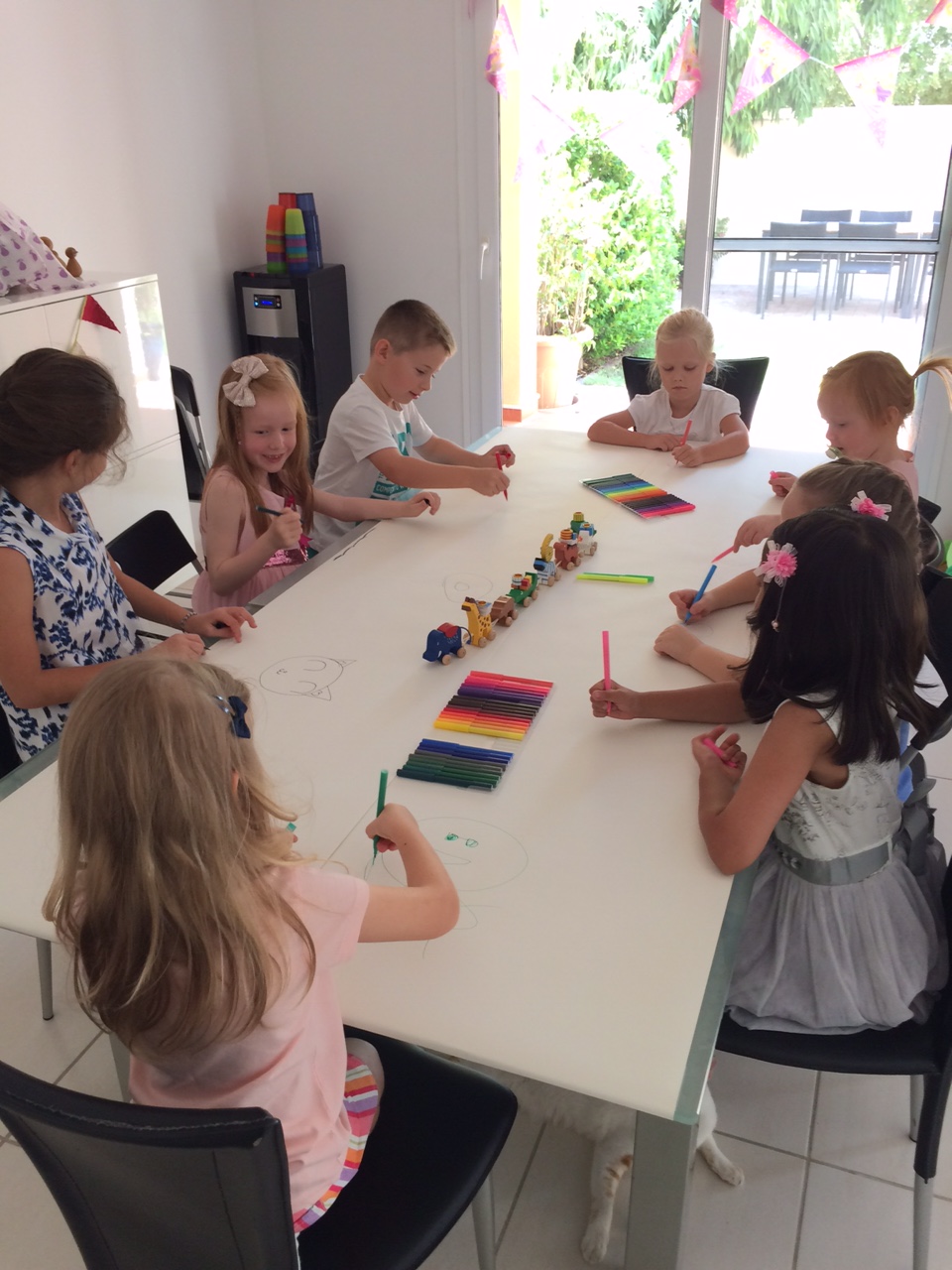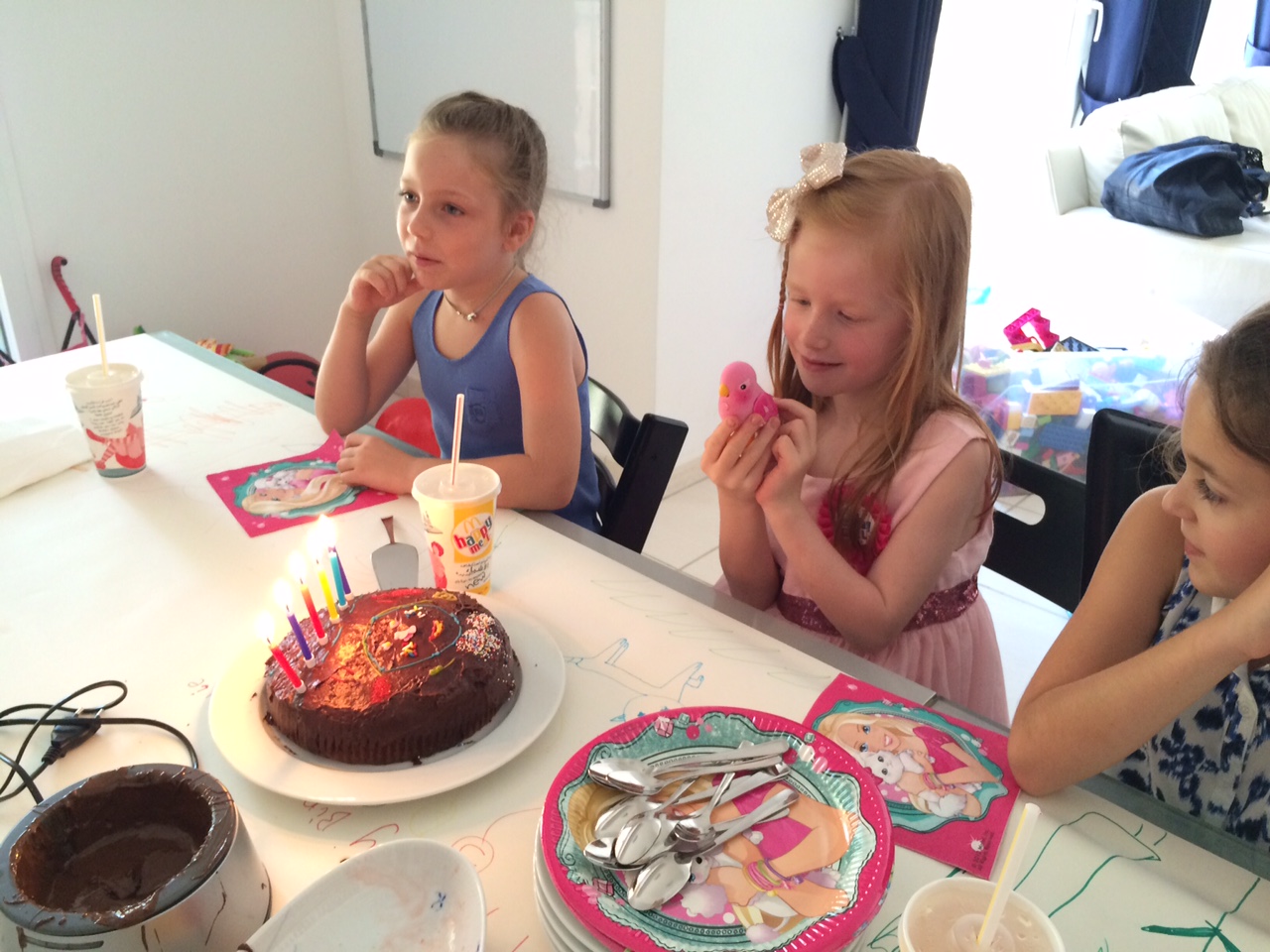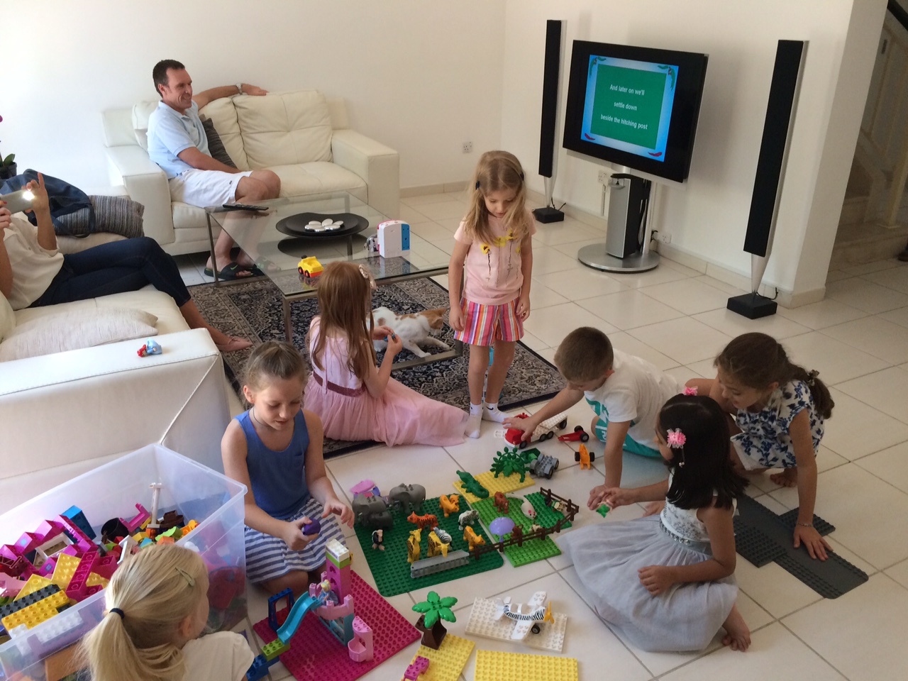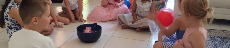 “There are no more party games planned. I guess you will have to figure out some games that you’d like to play together”, svarer jeg smilende og skubber plader og klodser frem mod pigerne, som artigt tager imod.