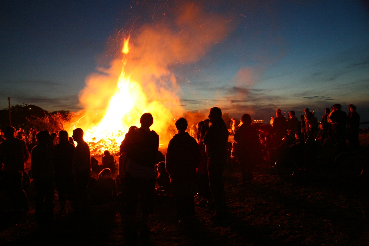 Den lyse aftenhimmel mod bålets orange flammer. Den danske strand med det karakteristiske, hvide sand.