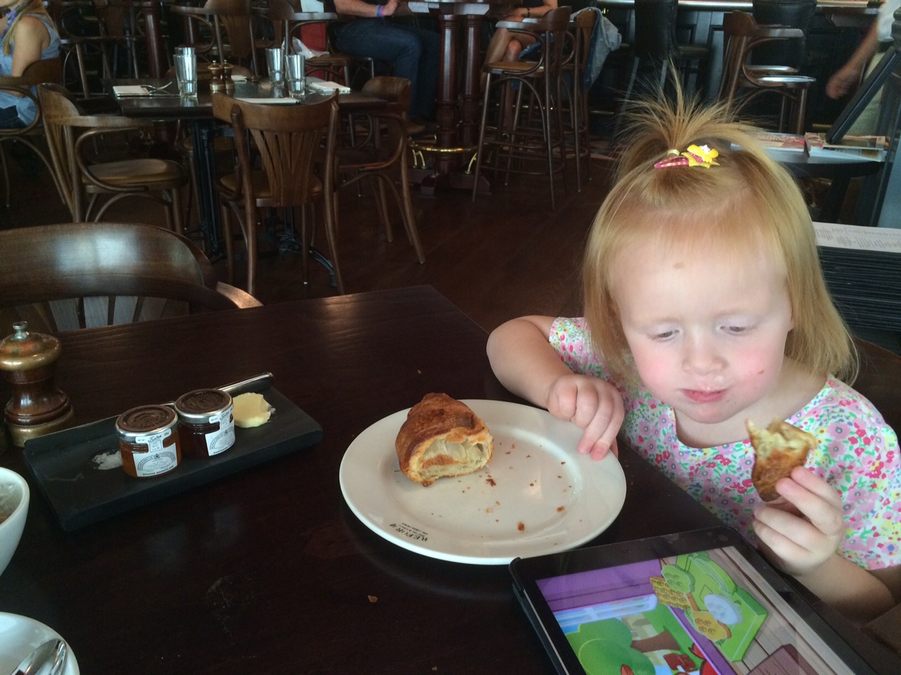 Vi finder en kaffelotte og en croissant (med rigeligt smør) i selskab med Fru F og M.