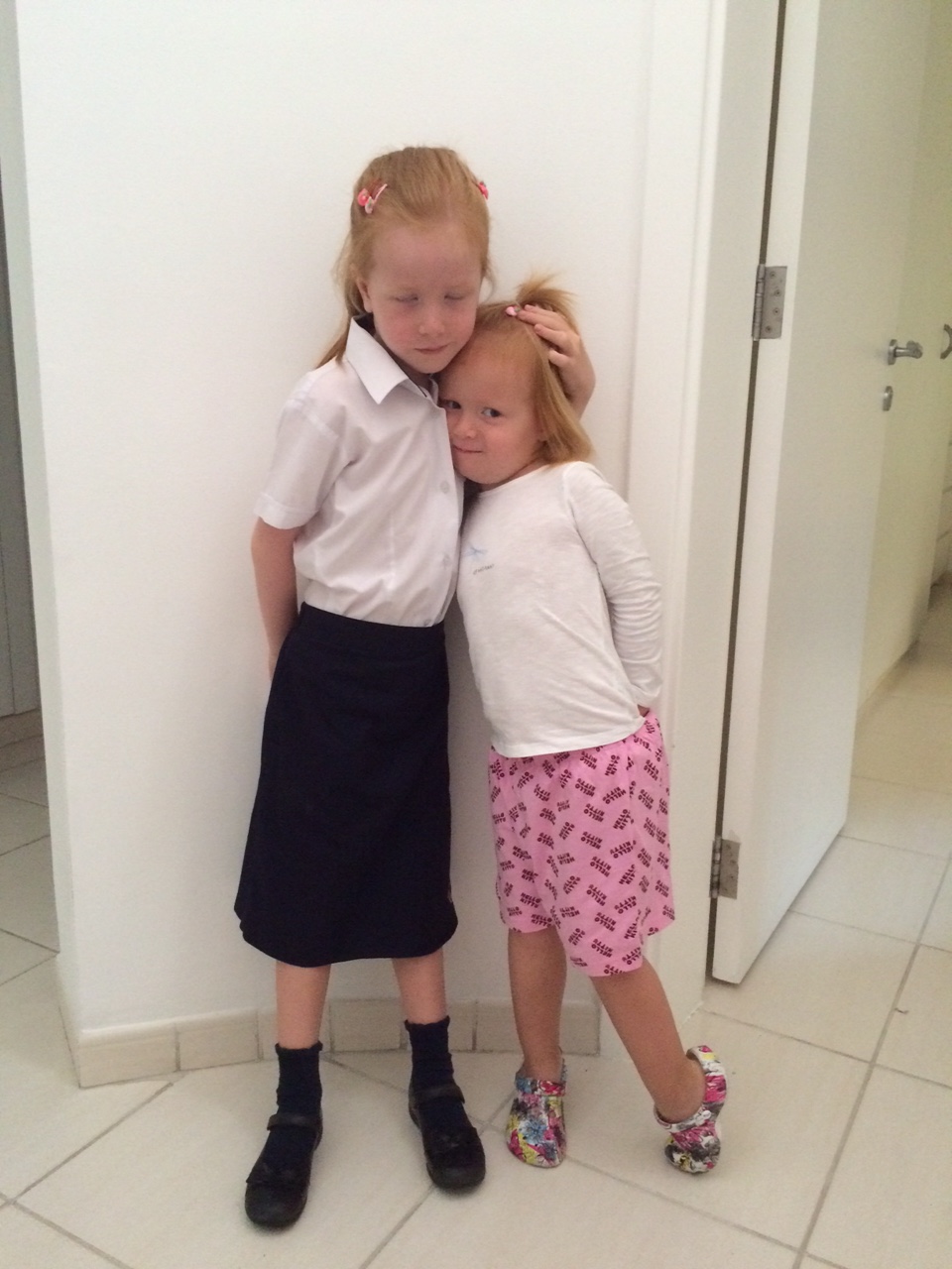 Vi møder Estelle i døren og jeg tager billeder af de 2 skønne piger. Og får en klump i halsen ved tanken om at det er deres allersidste skoledag sammen. Nogensinde.