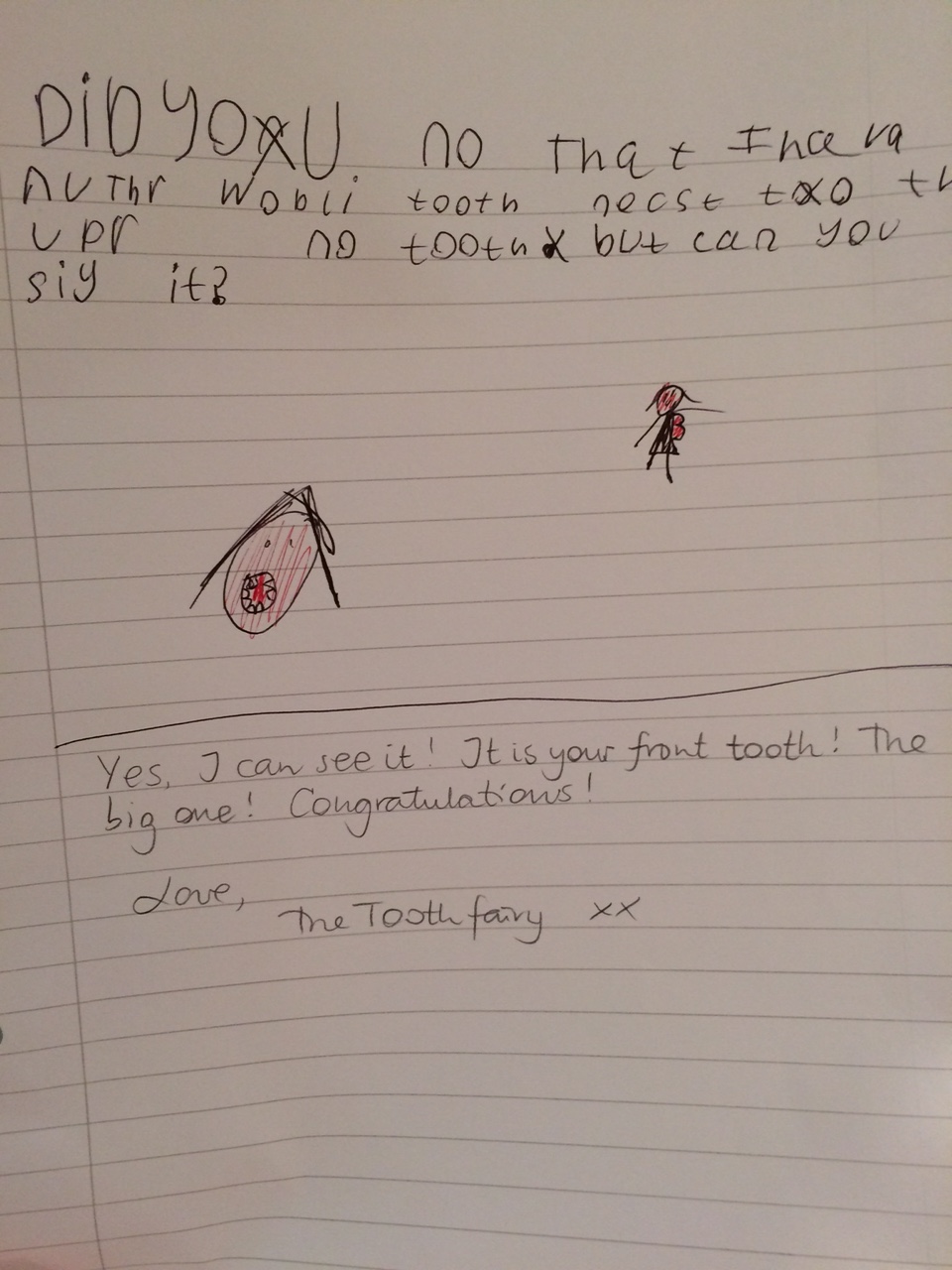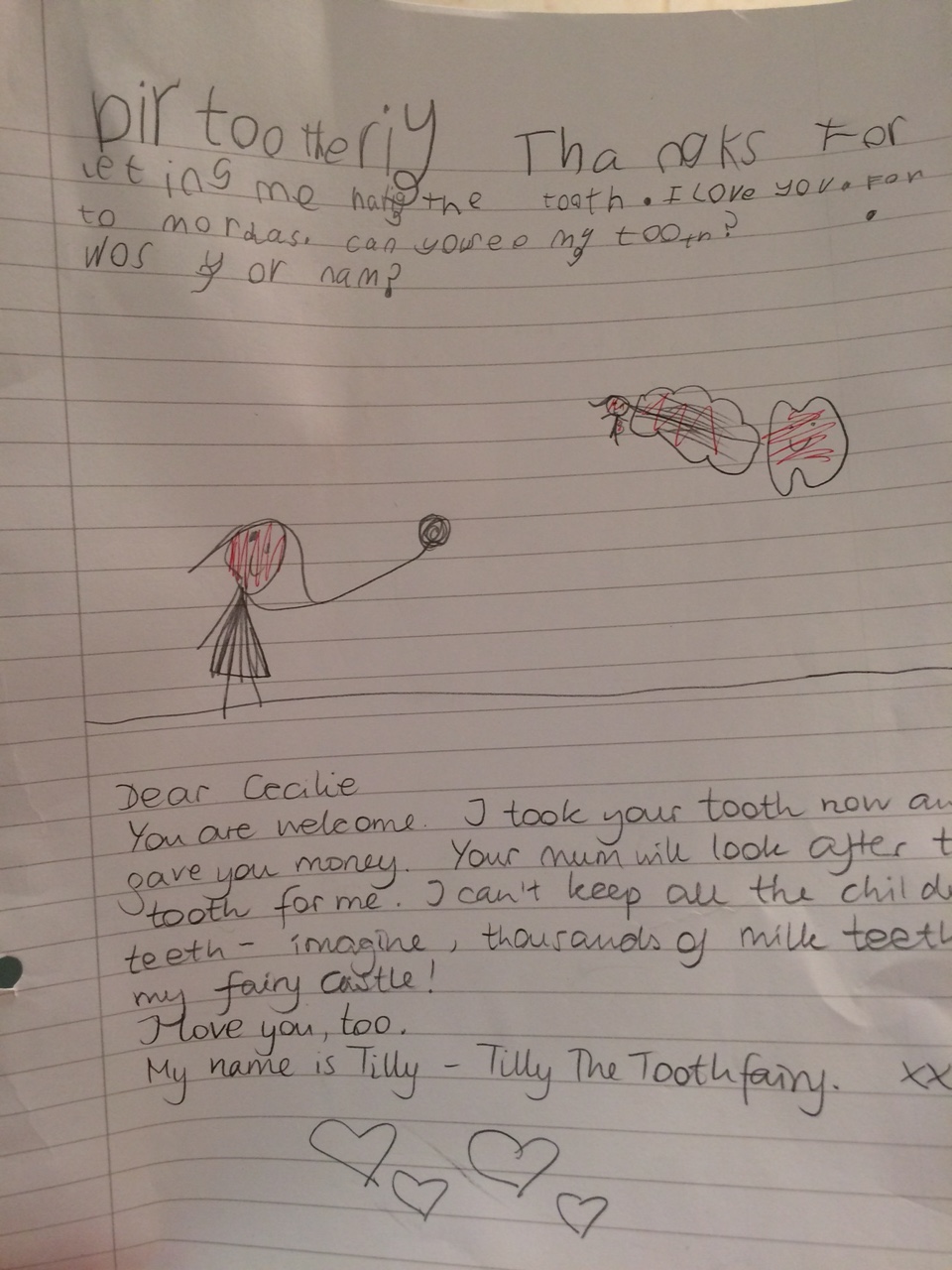 You are welcome. I took your tooth now and gave you money. Your Mum will look after the tooth for me. I can’t keep all the children’s teeth – imagine, thousands of milk teeth in my fairy castle!