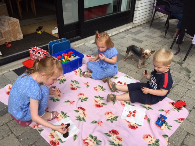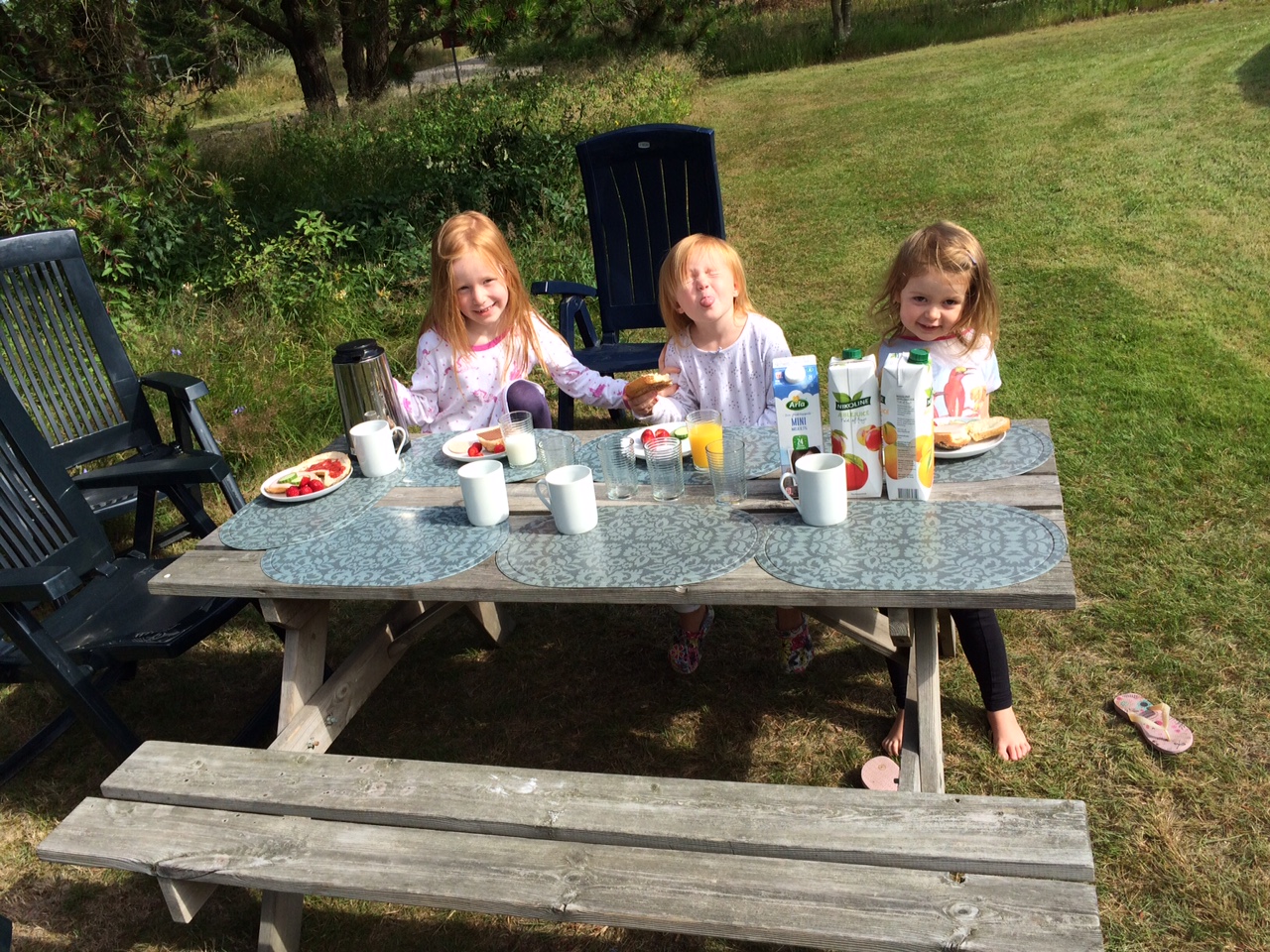 Vi spiser morgenmad i haven.