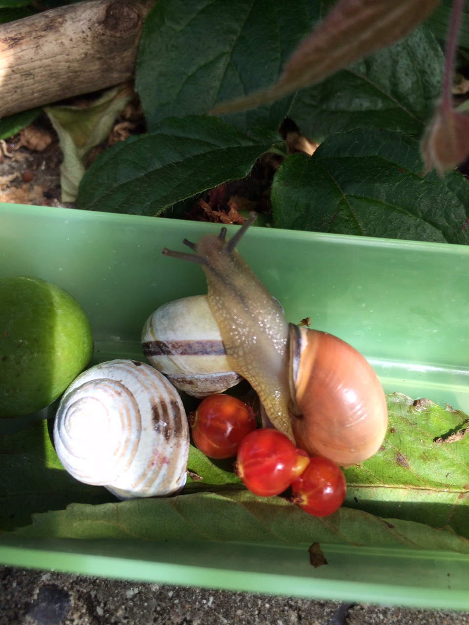 Sneglen Charlie har for eksempel fået selskab af en ‘aktiv’ snegl, som hilser mere end kærligt på. Måske ender det med en hel sneglekoloni, når vi vender retur til Farmors hus?