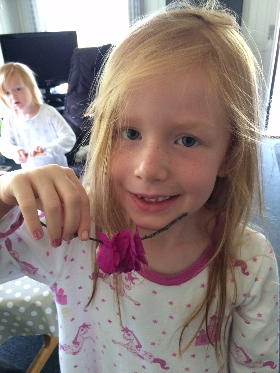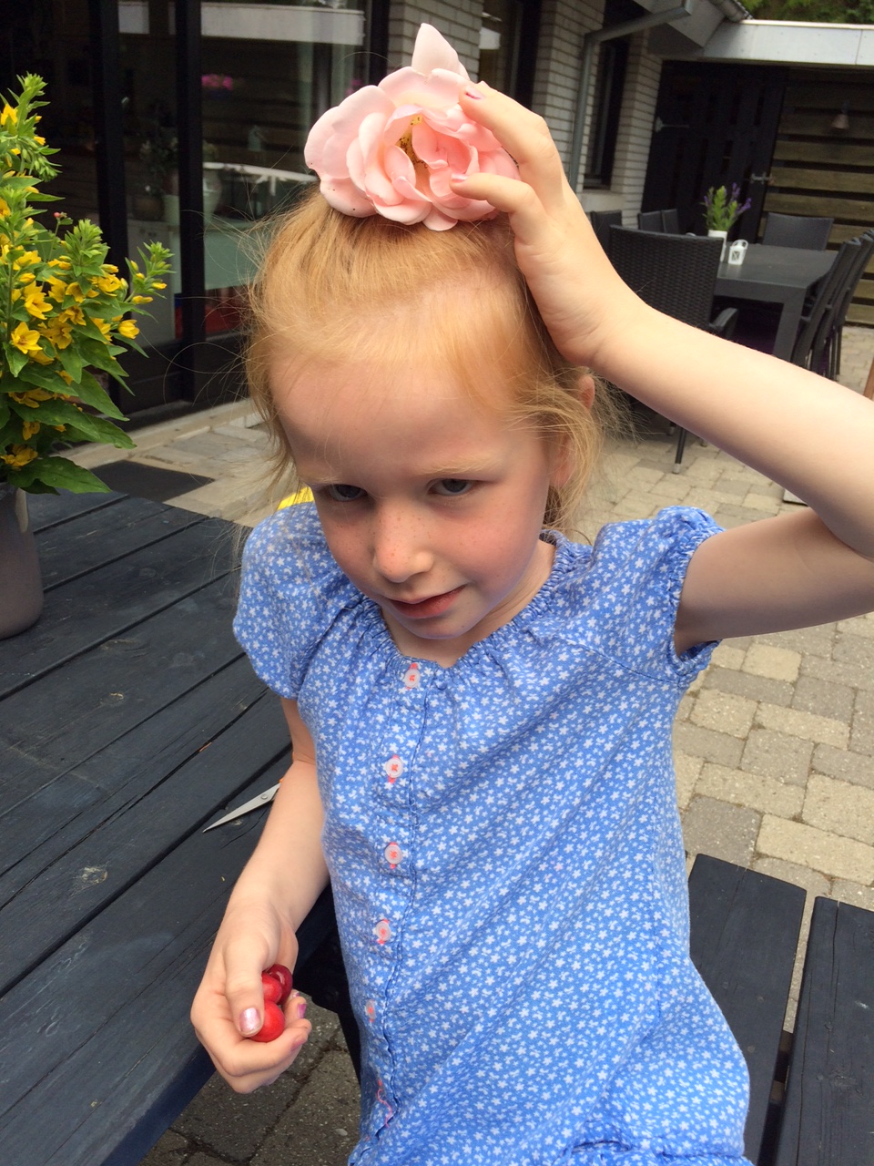 Næste morgen vågner Cille og trisser ud i haven for at sætte hybenrosenblade på strå. For det gjorde vi også sidste år. Hun elsker gentagelserne.