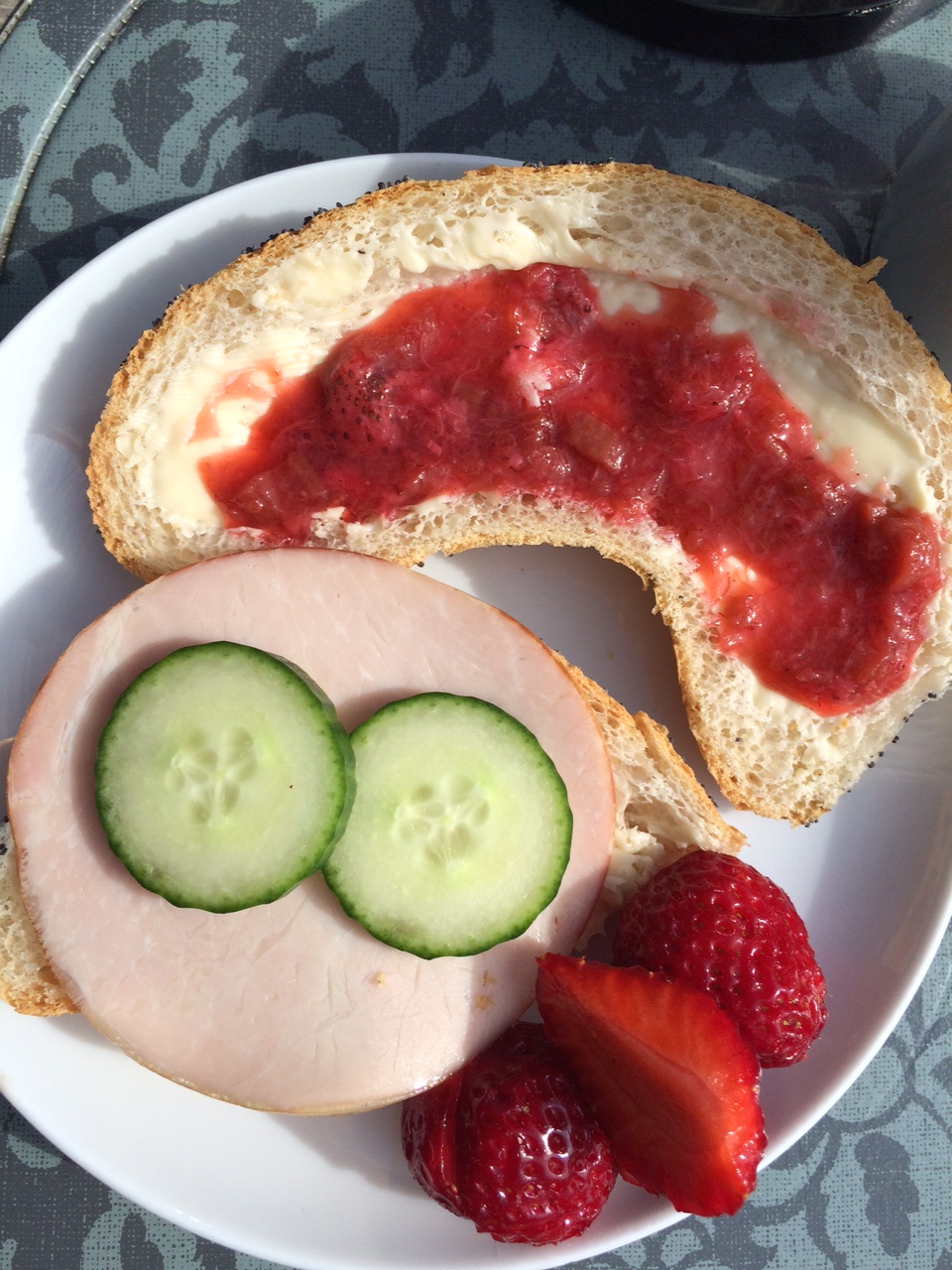 Mormors jordbær-råsylt på sprøde horn fra bageren på Blåvand Torv.