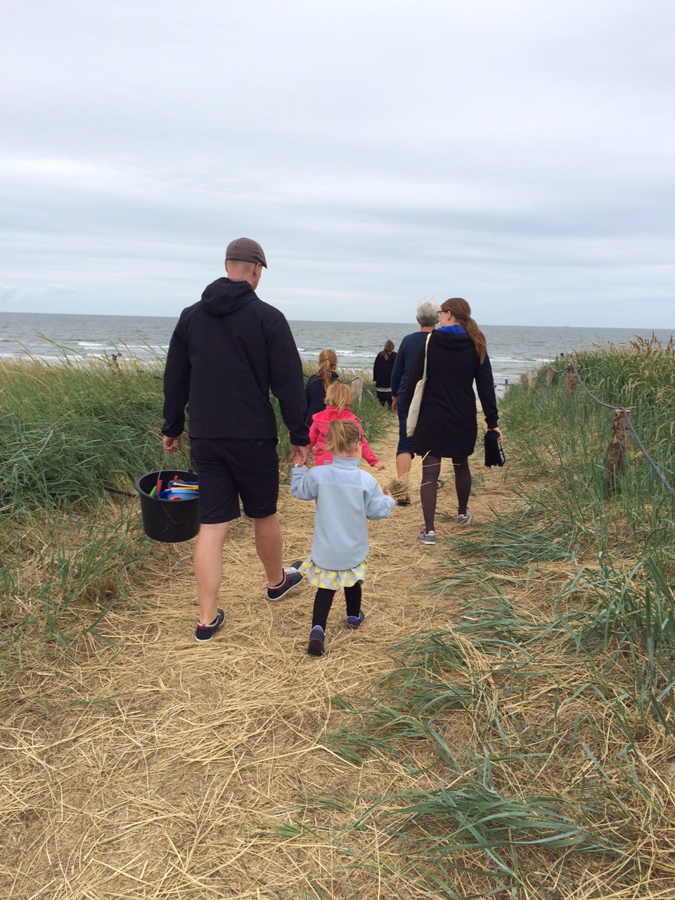 Hvidbjerg Strand kalder på os, da rundstykkerne er fortæret.