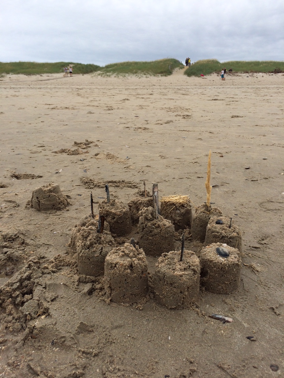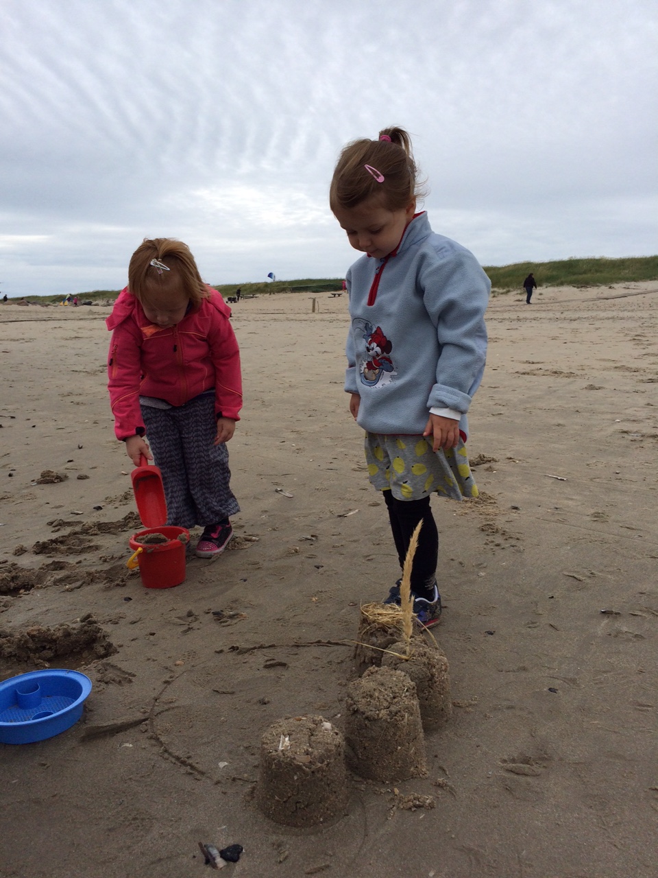 Vi bygger sandslotte, mens vi skutter os lidt i vinden. Her er 25 grader køligere end i Dubai-land og det kan selvfølgelig godt mærkes.