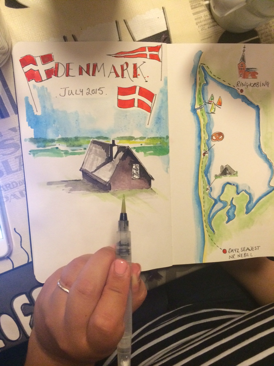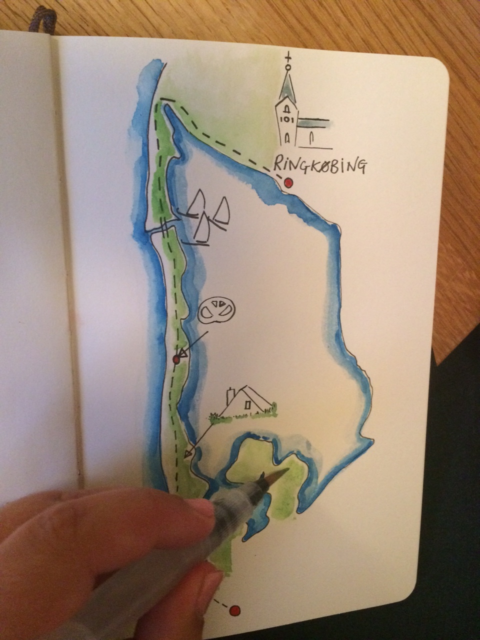 Fru Cox er en dygtig illustrator og maler – og hun sidder helt stille med sit rejse-akvarelsæt om aftenen, mens vi drikker vin og griner. Så producerer hun de fineste fortællinger fra dagens oplevelser.