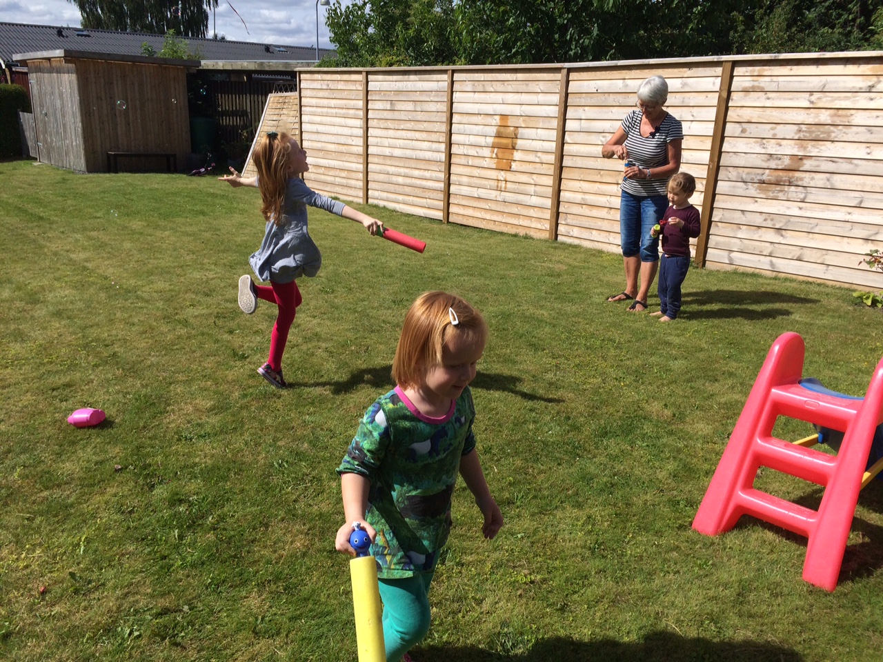 Efter at pigerne har soppet et par gange og fryyyyser lidt, sætter de Morfar i sving med gyngerne.