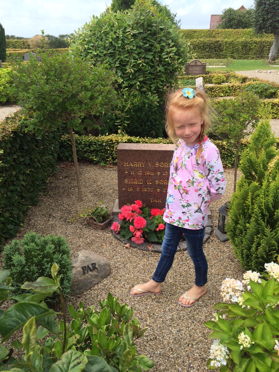 Morfar tager os med på kirkegården for at lægge lyserøde roser til Bedste på Fasters fødselsdag.