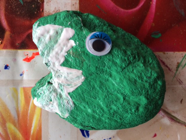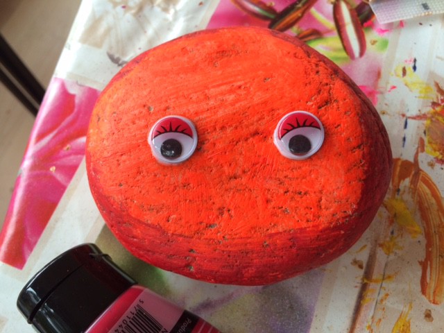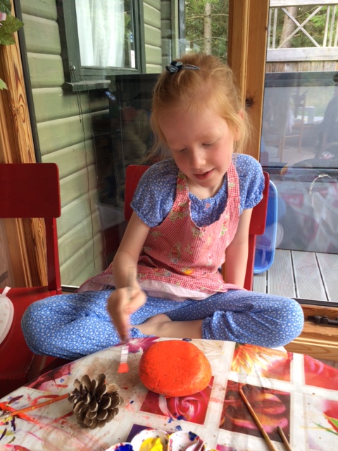 Farmor lakerer efterfølgende stenene med skibslak, så de kan holde til regn og rusk, når de står til pynt i haven.