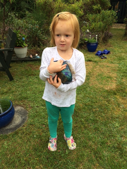 “Don’t worry, Mummy, jeg pick’er kun dem snegler med skaller på. Ikke dem dræbersnegler. Er de ikke bare søde?”, siger hun henført, mens hun aer sneglene.
