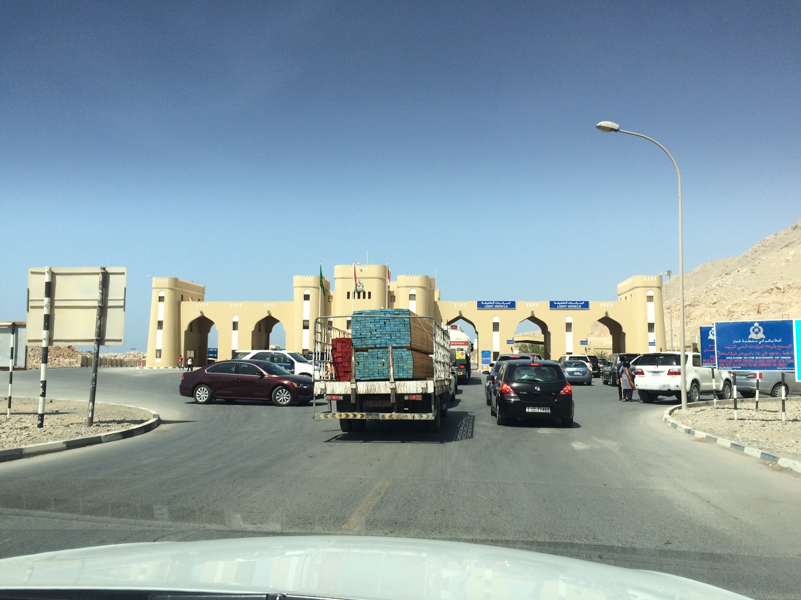 Vi har endda fornøjelsen af at stå i kø i halvanden time for at få stemplet passene og betalt for visum på Oman-siden. Og når man mindst forventer det, er pigerne faktisk englesøde.