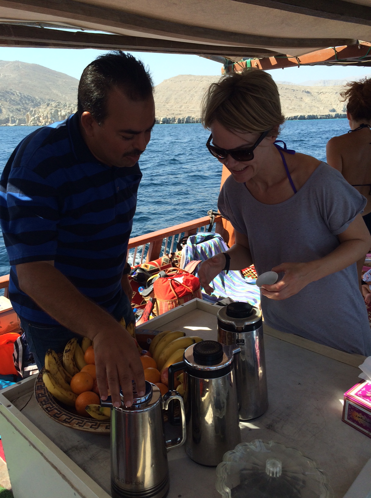 Besætningen byder med det samme på arabisk kaffe med kardemomme og de lækreste, små omani-dadler, dyrket i Khassab. De er glade, gæstfrie og utroligt hjælpsomme.