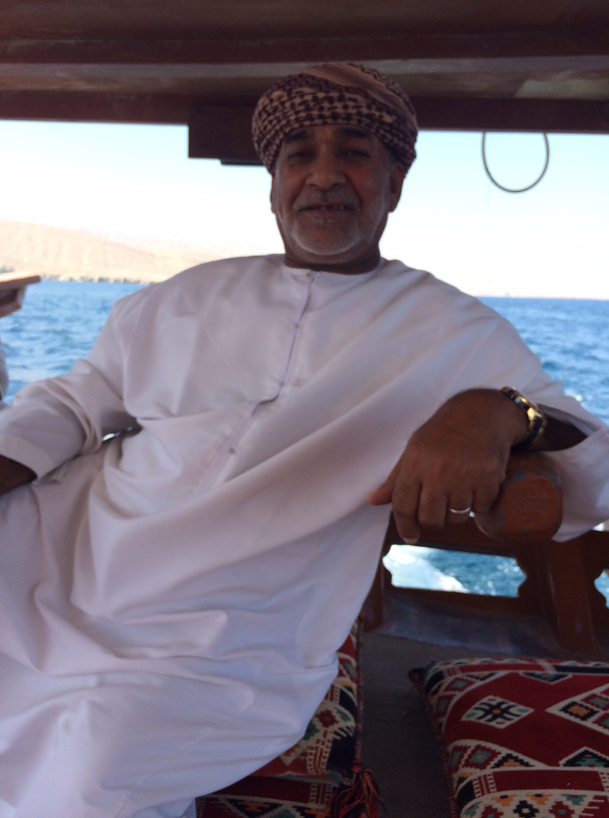 Med denne fantastiske Omani dhow-skipper ved roret, der stort set ikke ytrer sig undervejs – med undtagelse af et par diskrete bønner. Han taler ikke engelsk, men modtager meget gerne mine henvendelser med armsving, pegende fingre og begejstrede smil.