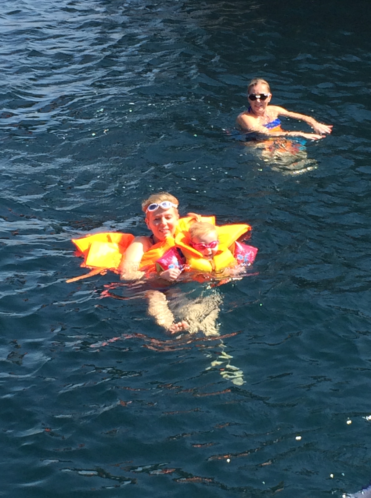 Vi har ikke fået købt voksen-flippers, men en redningsvest under maven er en stor hjælp, når vi svømmer med pigerne.