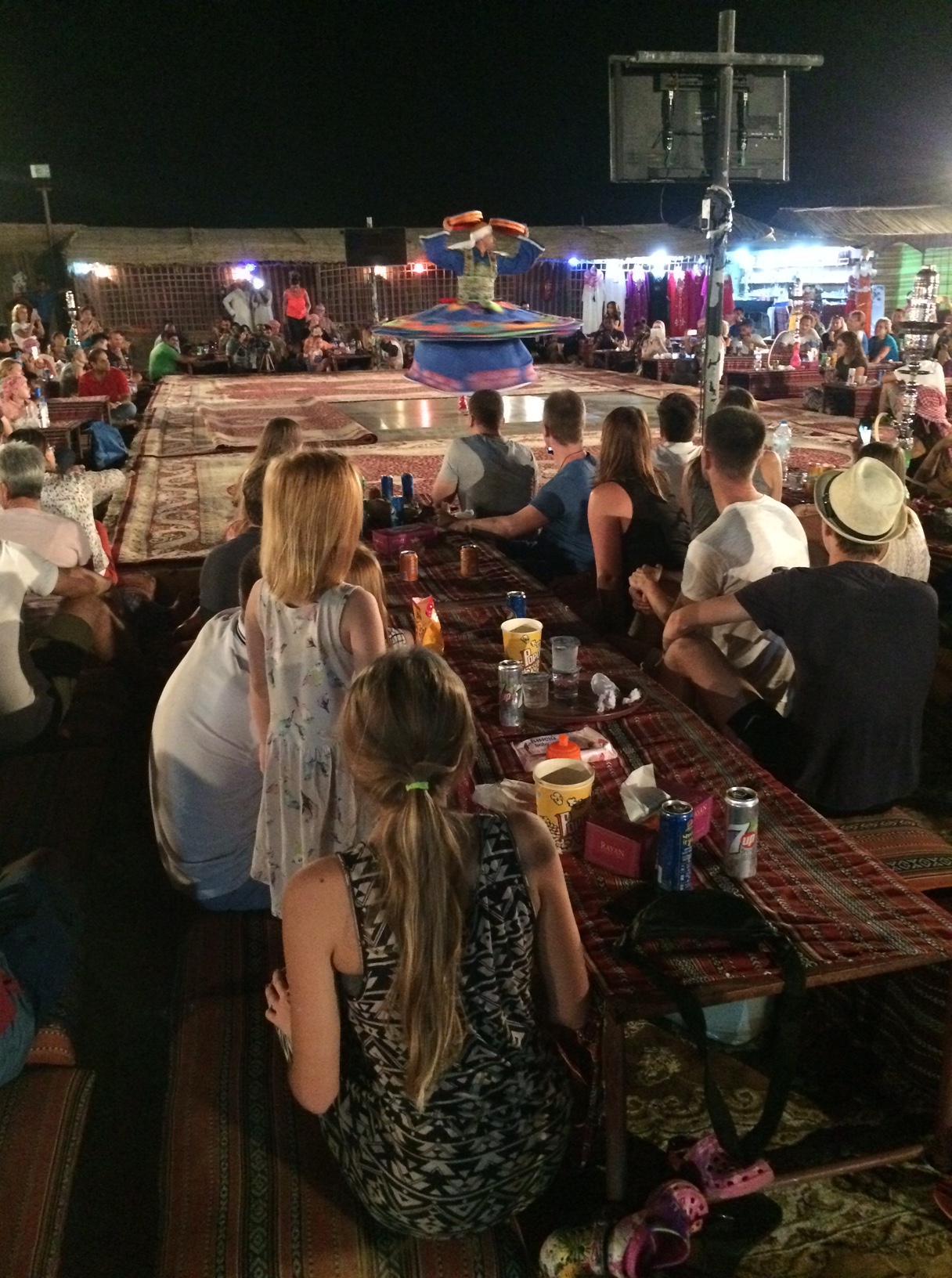 Efter en halv times rutschebanekørsel i sandet, ankommer vi til Arabian Night Tours’ Desert Camp, hvor vi har fornøjelsen af den arabiske version af spansk grisefest.