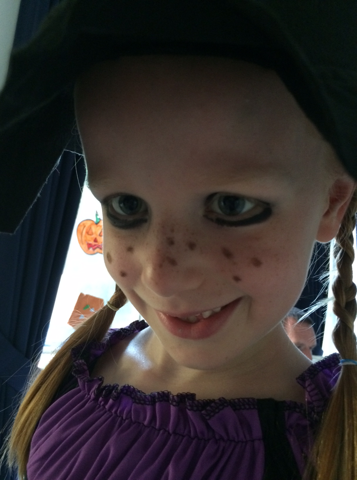 “Vi er friendly hekse, not scary ones”, proklamerer Mille, mens hun får en tur med den sorte kohl og den mørkeste øjenskygge, jeg kan finde i makeup-pungen.
