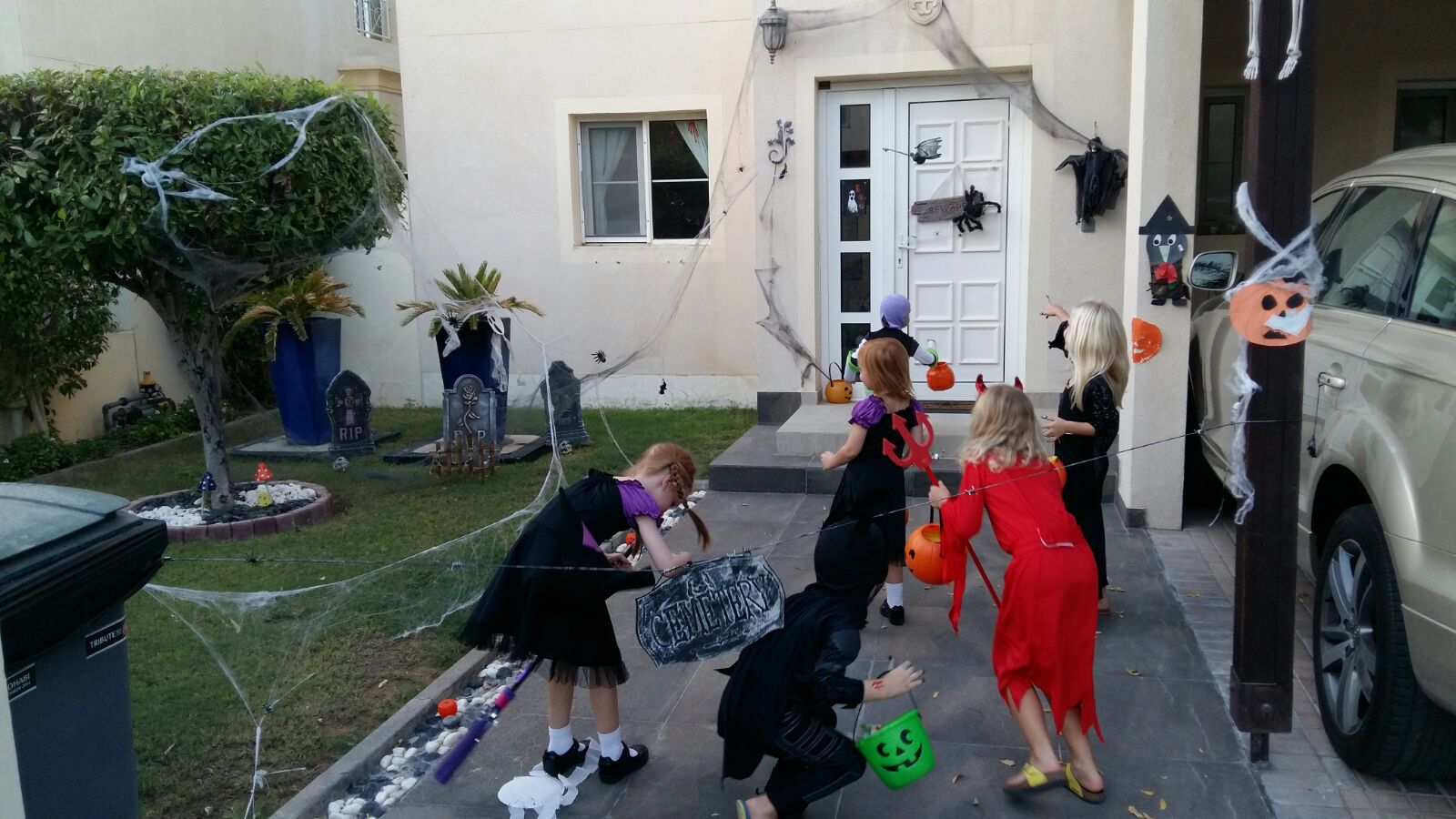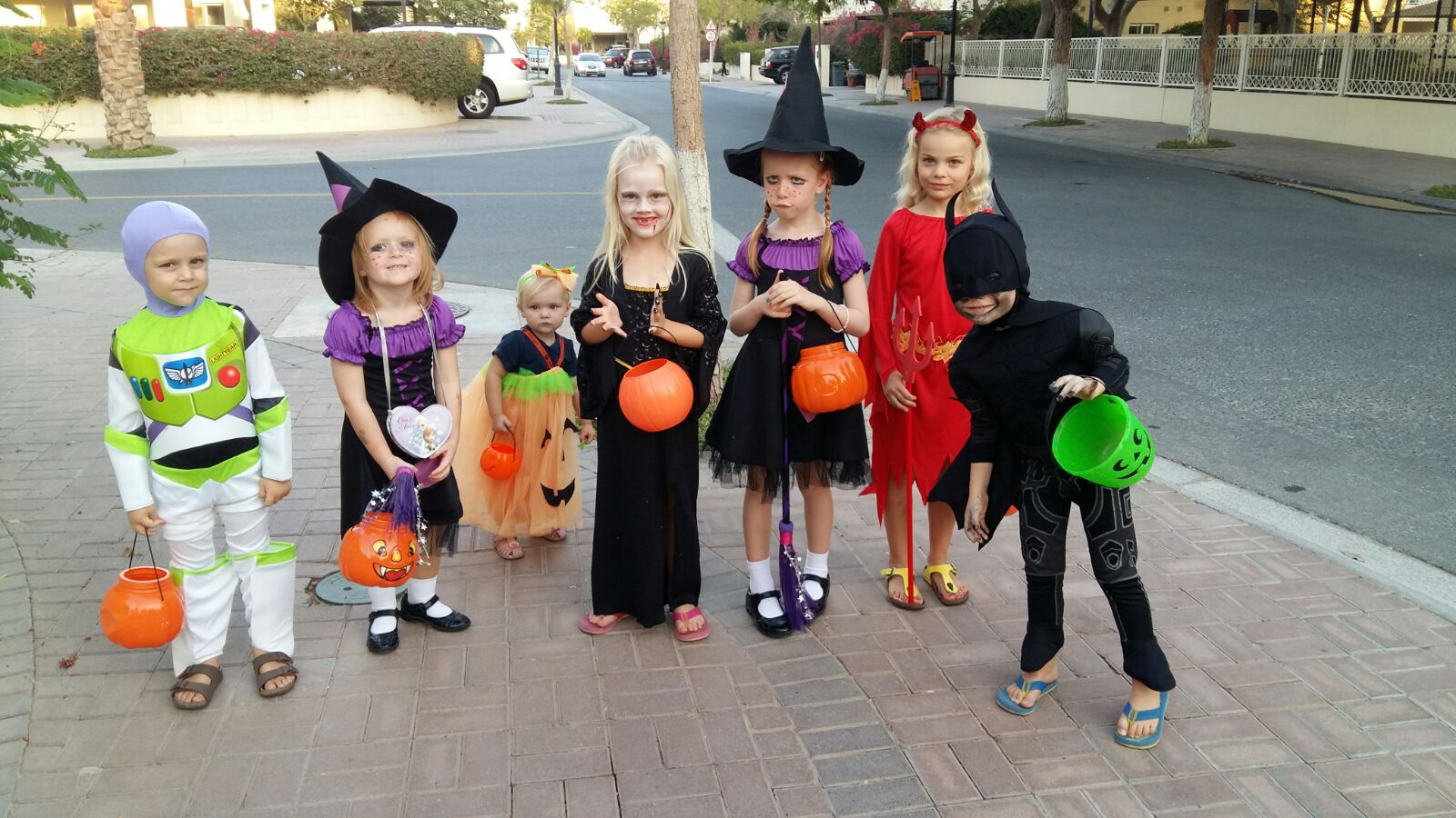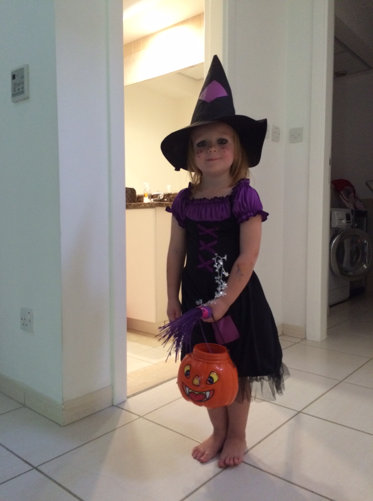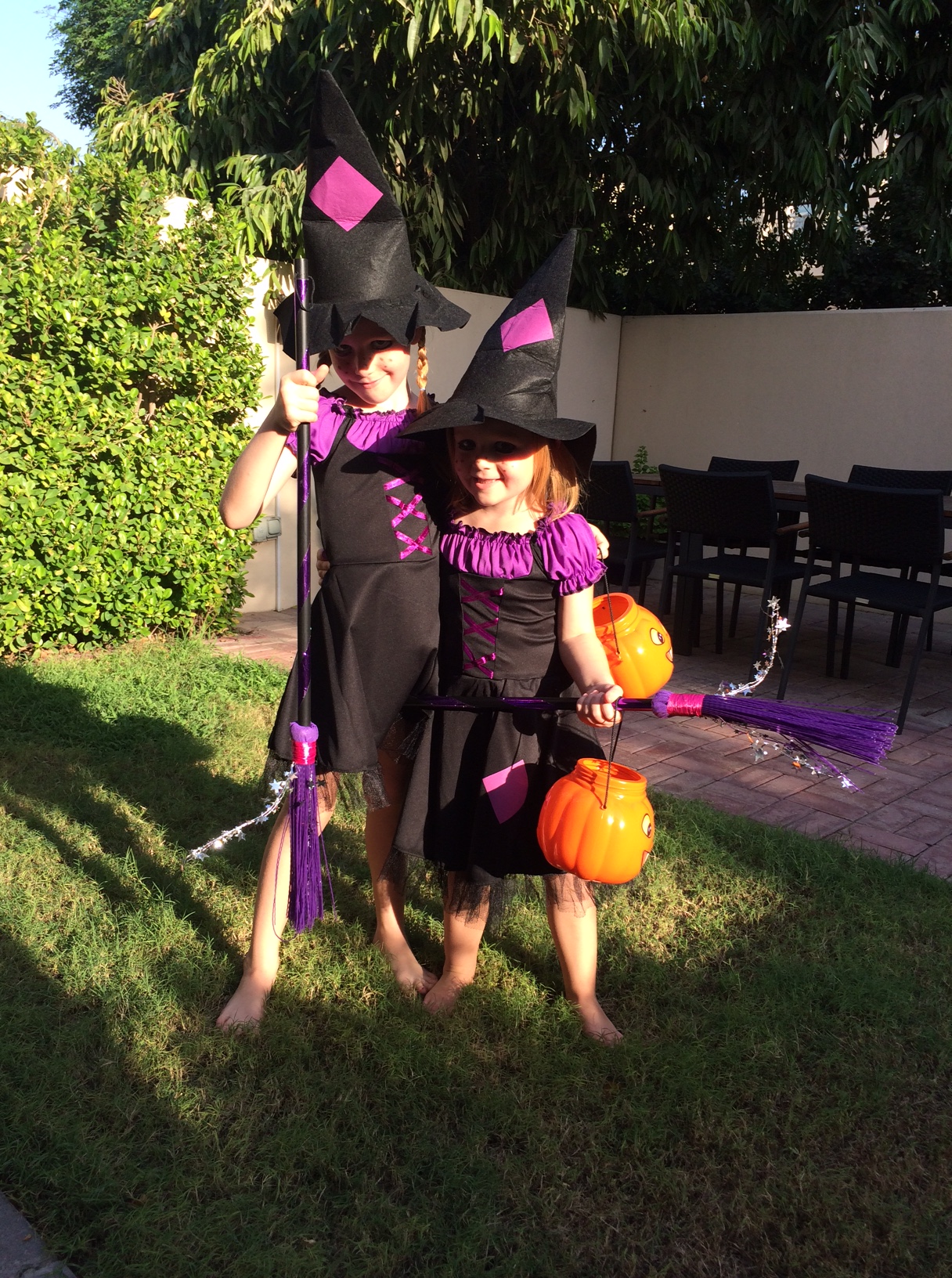 Og da de endelig får lov til at tage heksekostumerne på, spurter de over til naboen for at trick-or-treat’e ved højlys dag. Åh, den søde ventetid!