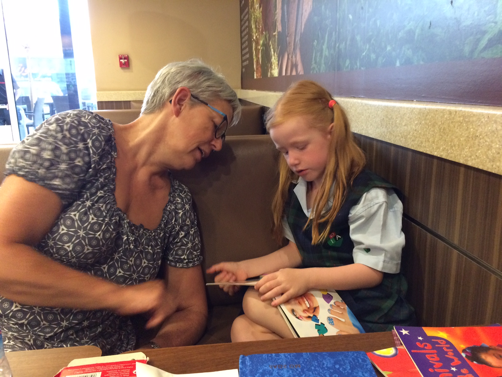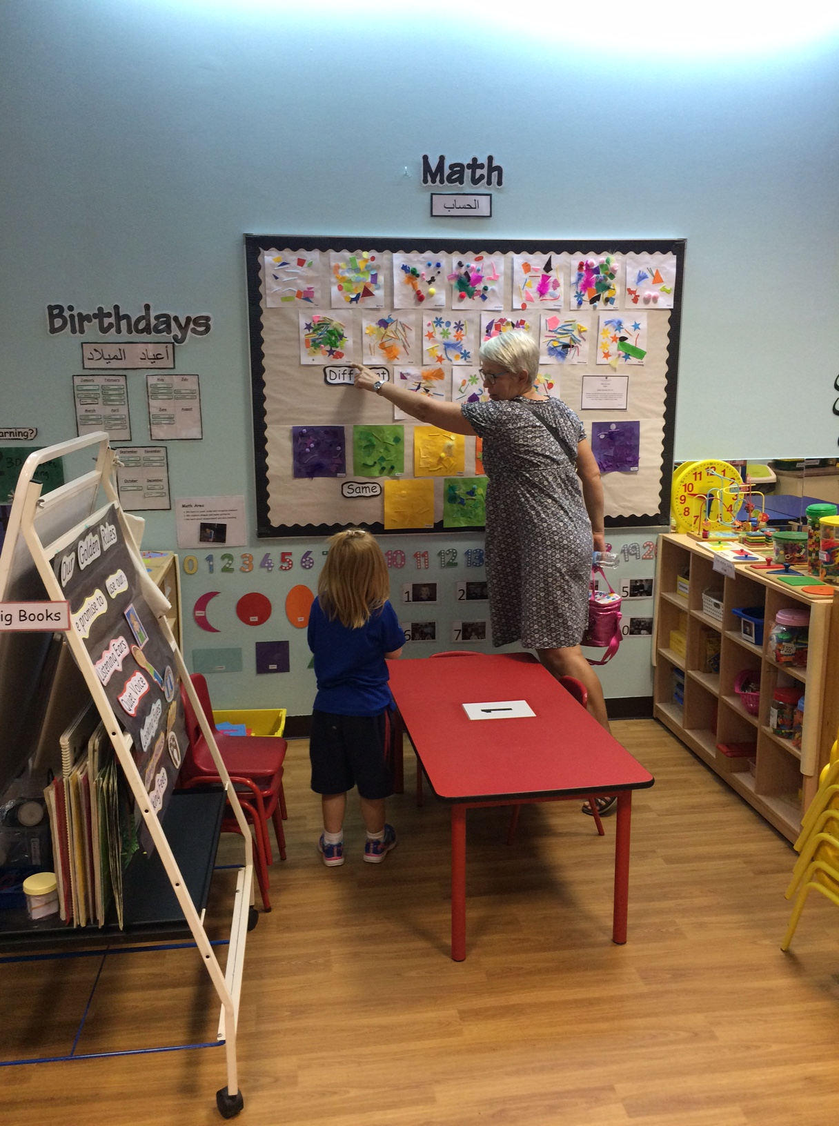 Her øver hun sig i at skrive mit navn og man kan se, at særligt ‘m’, ‘e’, ‘t’ og ‘i’ sidder i fingrene på hende.IMG_0630Mormor kommer hen på skolen om eftermiddagen, så hun kan få rundvisning af Den Bitte-Lille-Skolepige.IMG_0625Her forklarer Mille hende ivrigt om klassens regler.IMG_0626Som I måske fornemmer, er Mormor fløjet fra Vandkants-Danmark – trådt over dørtærsklen i en Ørkenstat – og vandret direkte ind i vores hverdag.