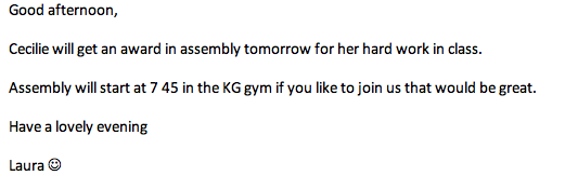 Det er åbenbart blevet Den Lille-Store Skolepiges tur til at modtage anerkendelse til 2. klassernes fællessamling i skolen.