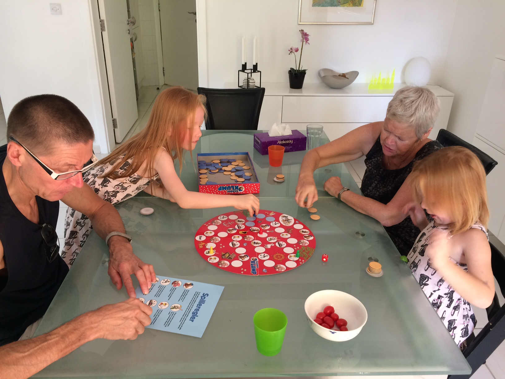 “Nær du lander o’ æ’ Pellekan, så ska’ du modta’ 2 pandekåwer og den jen’ ska’ du gi’ te’ di Ånkel”, læser Onkel Søren højt fra spilleregel-arket.