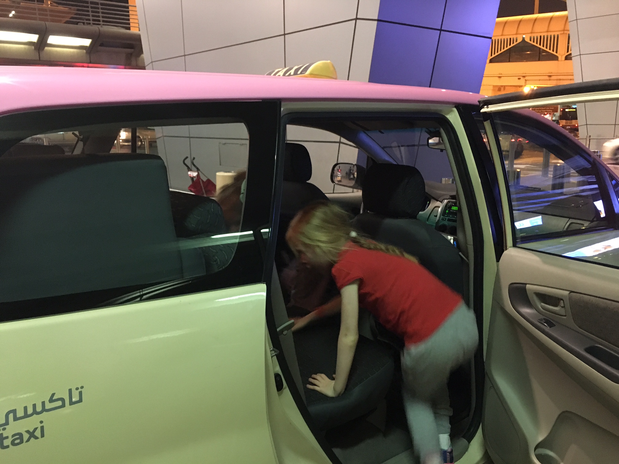 Da vi endelig kommer igennem lufthavnen, finder vi lynhurtigt en fin, lyserød Lady Cab, som køres af en flink dame med ligeså lyserødt tørklæde som taget på hendes Toyota.